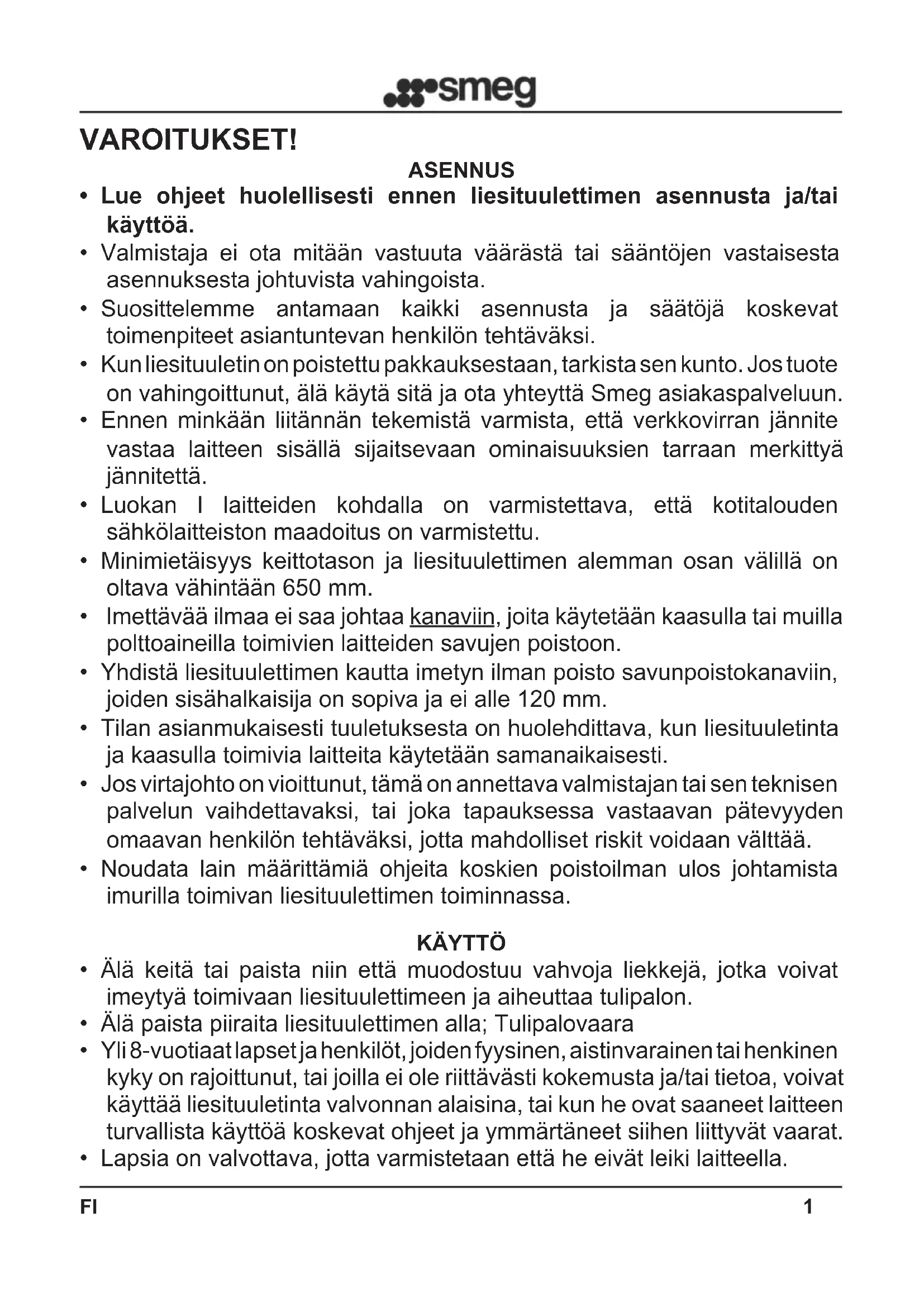 - Yli 8-vuotiaat lapset ja henkilöt, joiden fyysinen, aistinvarainen tai henkinen kyky on rajoittunut, tai joilla ei ole riittävästi kokemusta ja/tai tietoa, voivat käyttää liesituuletinta valvonnan alaisina, tai kun he ovat saaneet laitteen turvallista käyttöä koskevat ohjeet ja ymmärtäneet siihen liittyvät vaarat.