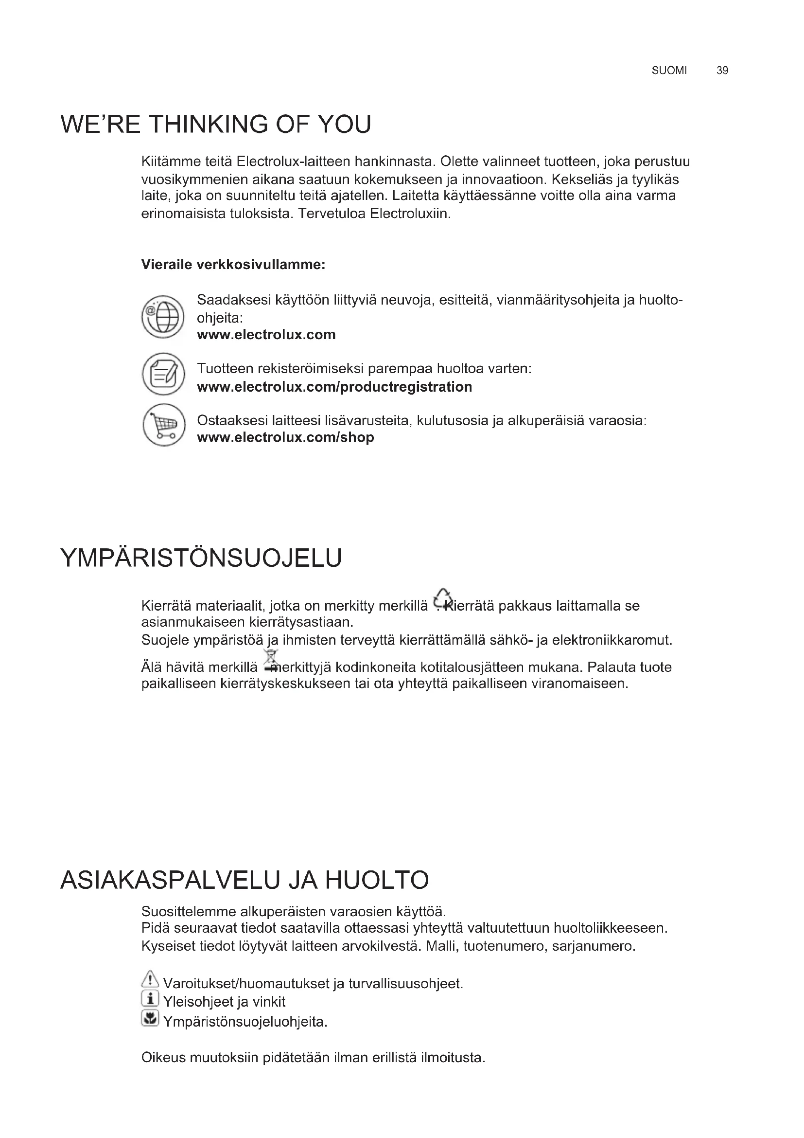 Suosittelemme alkuperäisten varaosien käyttöä. Pidä seuraavat tiedot saatavilla ottaessasi yhteyttä valtuutettuun huoltoliikkeeseen. Kyseiset tiedot löytyvät laitteen arvokilvestä. Malli, tuotenumero, sarjanumero. Varoitukset/huomautukset ja turvallisuusohjeet. Yleisohjeet ja vinkit Ympäristönsuojeluohjeita. Oikeus muutoksiin pidätetään ilman erillistä ilmoitusta. FI KÄYTTÖOHJEETwww.electrolux.com