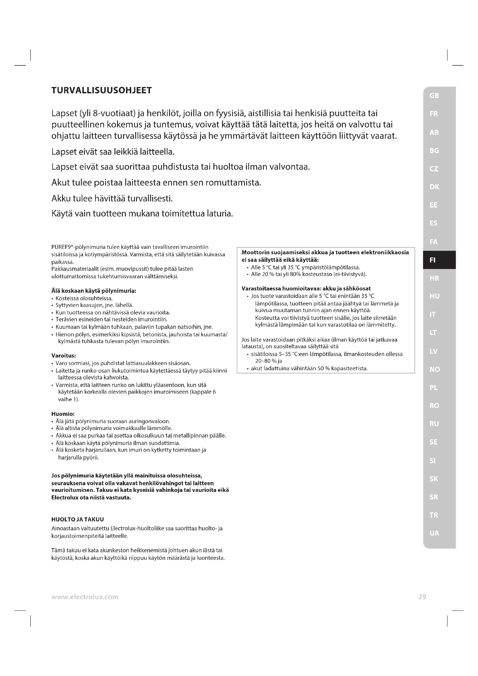 Ainoastaan valtuutettu Electrolux-huoltoliike saa suorittaa huolto- ja korjaustoimenpiteitä laitteelle. Tämä takuu ei kata akunkeston heikkenemistä johtuen akun iästä tai käytöstä, koska akun käyttöikä riippuu käytön määrästä ja luonteesta.TR