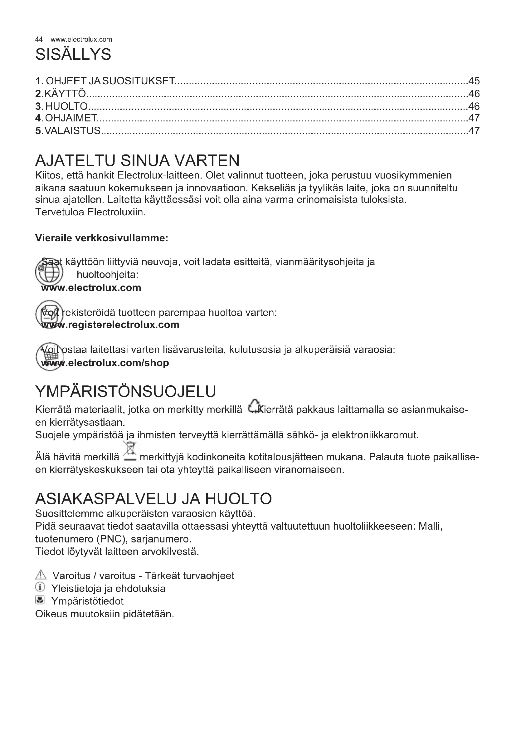 Kiitos, että hankit Electrolux-laitteen. Olet valinnut tuotteen, joka perustuu vuosikymmenien aikana saatuun kokemukseen ja innovaatioon. Kekseliäs ja tyylikäs laite, joka on suunniteltu sinua ajatellen. Laitetta käyttäessäsi voit olla aina varma erinomaisista tuloksista. Tervetuloa Electroluxiin. Vieraile verkkosivullamme: Saat käyttöön liittyviä neuvoja, voit ladata esitteitä, vianmääritysohjeita ja huoltoohjeita: www.electrolux.com Voit rekisteröidä tuotteen parempaa huoltoa varten: www.registerelectrolux.com Voit ostaa laitettasi varten lisävarusteita, kulutusosia ja alkuperäisiä varaosia: www.electrolux.com/shop