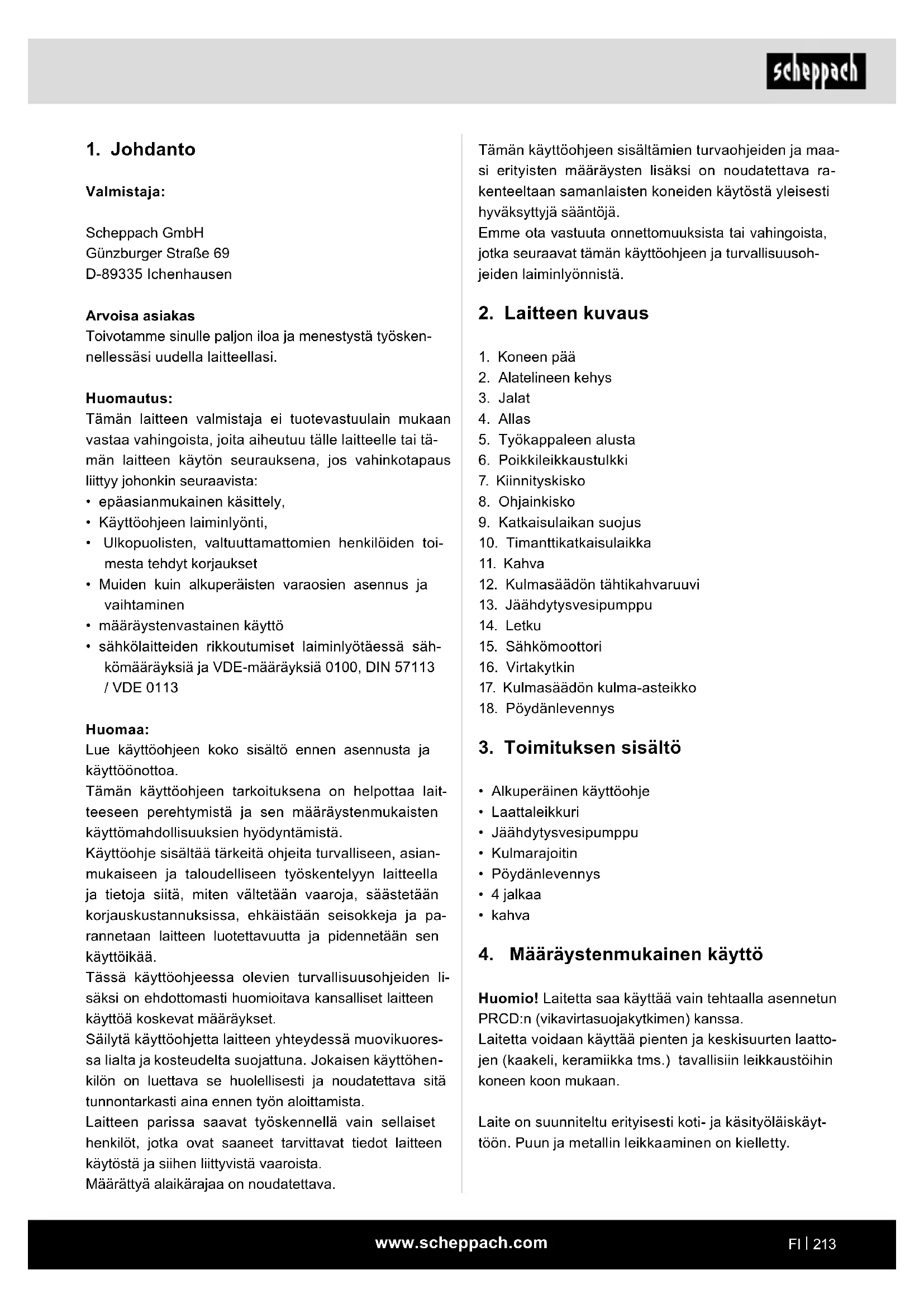 Valmistaja: Scheppach GmbH Günzburger Straße 69 D-89335 Ichenhausen Arvoisa asiakas Toivotamme sinulle paljon iloa ja menestystä työsken- nellessäsi uudella laitteellasi. Huomautus: Tämän laitteen valmistaja ei tuotevastuulain mukaan vastaa vahingoista, joita aiheutuu tälle laitteelle tai tä- män laitteen käytön seurauksena, jos vahinkotapaus liittyy johonkin seuraavista: