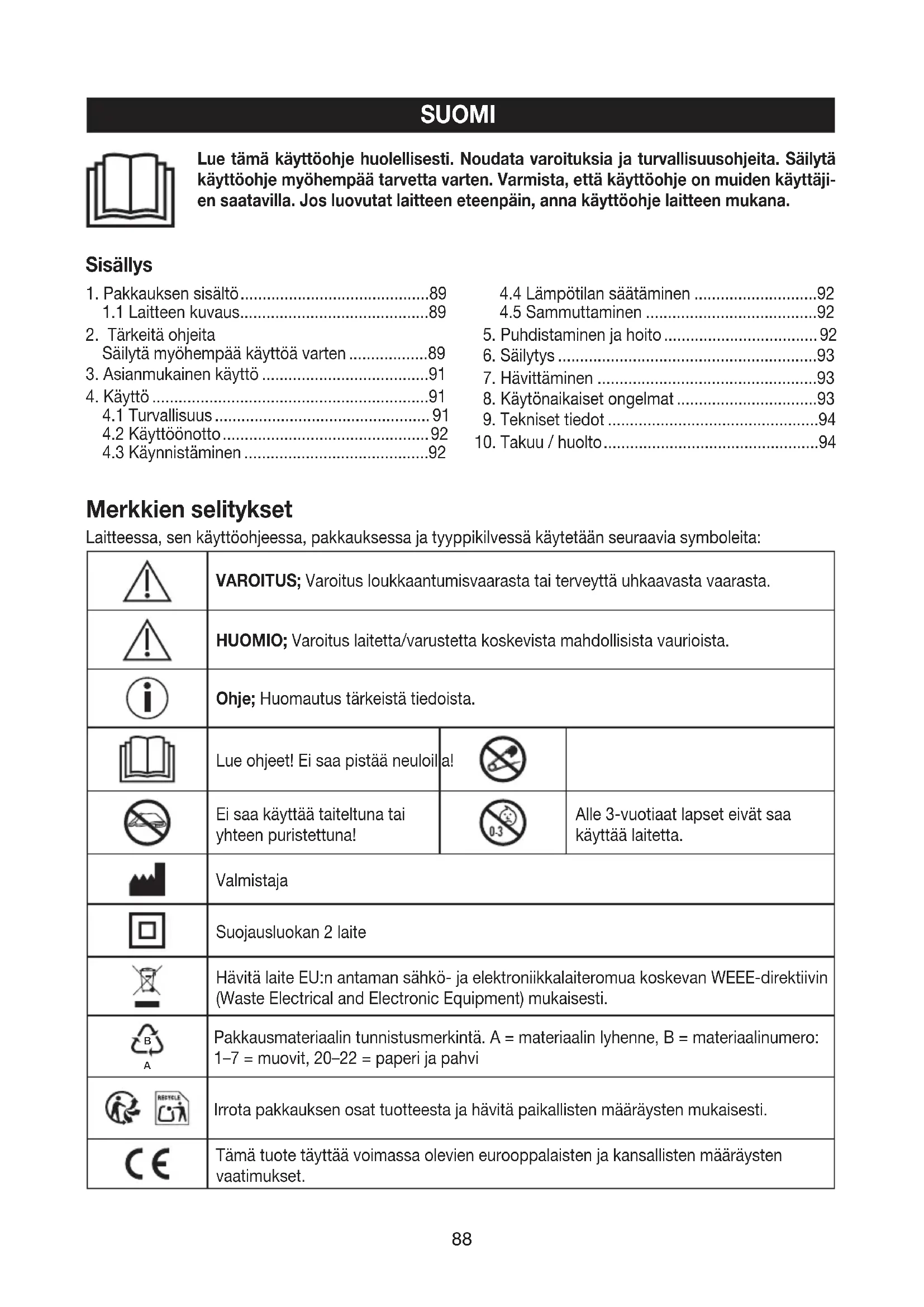 Du finner detaljert informasjon om garantien og garantivilkårene på det medfølgende garantiarket. Med forbehold om evt. feil og endringer88 SUOMI Merkkien selitykset Laitteessa, sen käyttöohjeessa, pakkauksessa ja tyyppikilvessä käytetään seuraavia symboleita: VAROITUS; Varoitus loukkaantumisvaarasta tai terveyttä uhkaavasta vaarasta. HUOMIO; Varoitus laitetta/varustetta koskevista mahdollisista vaurioista. Ohje; Huomautus tärkeistä tiedoista. Lue ohjeet! Ei saa pistää neuloilla! Ei saa käyttää taiteltuna tai yhteen puristettuna! Alle 3-vuotiaat lapset eivät saa käyttää laitetta. Valmistaja Suojausluokan 2 laite Hävitä laite EU:n antaman sähkö- ja elektroniikkalaiteromua koskevan WEEE-direktiivin (Waste Electrical and Electronic Equipment) mukaisesti.