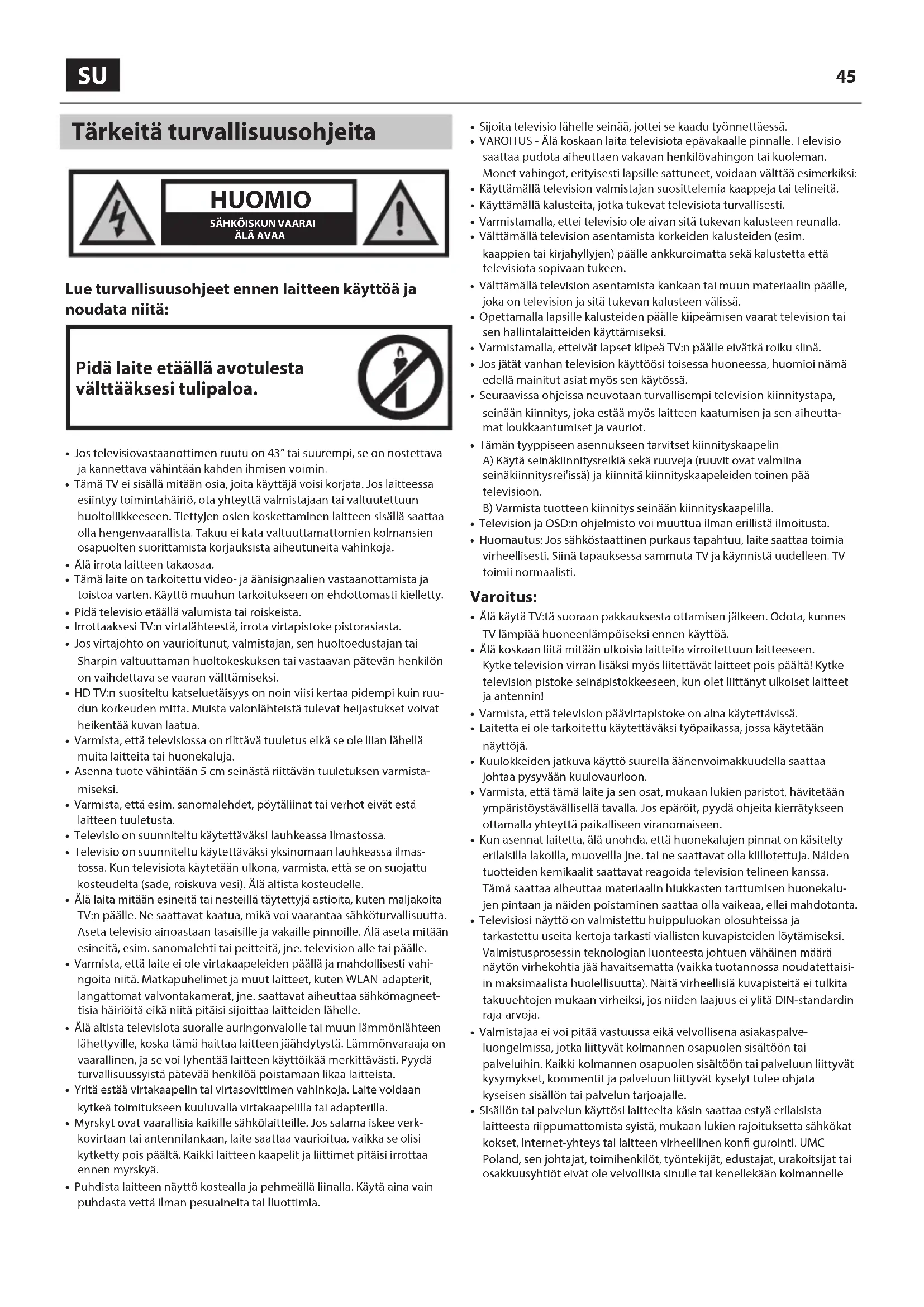 - Tämä TV ei sisällä mitään osia, joita käyttäjä voisi korjata. Jos laitteessa esiintyy toimintahäiriö, ota yhteyttä valmistajaan tai valtuutettuun huoltoliikkeeseen. Tiettyjen osien koskettaminen laitteen sisällä saattaa olla hengenvaarallista. Takuu ei kata valtuuttamattomien kolmansien osapuolten suorittamista korjauksista aiheutuneita vahinkoja.