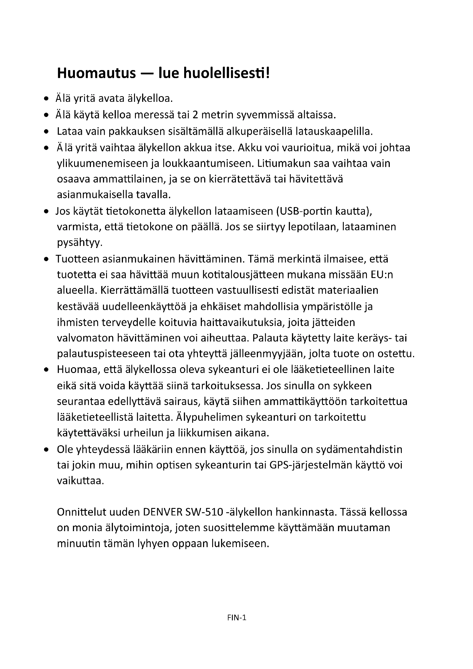www.facebook.com/denverelectronics SUOMIFIN-1 Huomautus — lue huolellisesti! Älä yritä avata älykelloa. Älä käytä kelloa meressä tai 2 metrin syvemmissä altaissa. Lataa vain pakkauksen sisältämällä alkuperäisellä latauskaapelilla. Älä yritä vaihtaa älykellon akkua itse. Akku voi vaurioitua, mikä voi johtaa ylikuumenemiseen ja loukkaantumiseen. Litiumakun saa vaihtaa vain osaava ammattilainen, ja se on kierrätettävä tai hävitettävä asianmukaisella tavalla. Jos käytät tietokonetta älykellon lataamiseen (USB-portin kautta), varmista, että tietokone on päällä. Jos se siirtyy lepotilaan, lataaminen pysähtyy. Tuotteen asianmukainen hävittäminen. Tämä merkintä ilmaisee, että tuotetta ei saa hävittää muun kotitalousjätteen mukana missään EU:n alueella. Kierrättämällä tuotteen vastuullisesti edistät materiaalien kestävää uudelleenkäyttöä ja ehkäiset mahdollisia ympäristölle ja ihmisten terveydelle koituvia haittavaikutuksia, joita jätteiden valvomaton hävittäminen voi aiheuttaa. Palauta käytetty laite keräys- tai palautuspisteeseen tai ota yhteyttä jälleenmyyjään, jolta tuote on ostettu. Huomaa, että älykellossa oleva sykeanturi ei ole lääketieteellinen laite eikä sitä voida käyttää siinä tarkoituksessa. Jos sinulla on sykkeen seurantaa edellyttävä sairaus, käytä siihen ammattikäyttöön tarkoitettua lääketieteellistä laitetta. Älypuhelimen sykeanturi on tarkoitettu käytettäväksi urheilun ja liikkumisen aikana. Ole yhteydessä lääkäriin ennen käyttöä, jos sinulla on sydämentahdistin tai jokin muu, mihin optisen sykeanturin tai GPS-järjestelmän käyttö voi vaikuttaa. Onnittelut uuden DENVER SW-510 -älykellon hankinnasta. Tässä kellossa on monia älytoimintoja, joten suosittelemme käyttämään muutaman minuutin tämän lyhyen oppaan lukemiseen.FIN-2 Tärkeimmät ominaisuudet: Bluetooth-älykello GPS-toiminnolla ja sykeanturilla Multi-Sport-tila (juoksu, kävely, kiipeily, pyöräily ja sisäjuoksu) Seuraa suoritustasoasi, tarkkaile sykettäsi ja tallenna reittisi Näyttää sää ja lämpötilan Voit käyttää sitä päivittäisen askelmäärän ja unen laadun mittaamiseen Synkronoi yhteystietoluettelo ja vastaa puheluihin tai hylkää ne suoraan kellon kautta Näyttää tekstiviestit, sähköpostiviestit, kalenteritapahtumat ja sosiaalisen median tapahtumat Musiikin hallinta etänä, kuvan ottaminen älypuhelimella etänä 500 mAh:n litiumpolymeeriakku 7–10 päivän valmiusajalla Yhteensopiva iOS7:n ja uudempien tai Android 4.4:n ja uudempien kanssa Yleiskatsaus Älykello