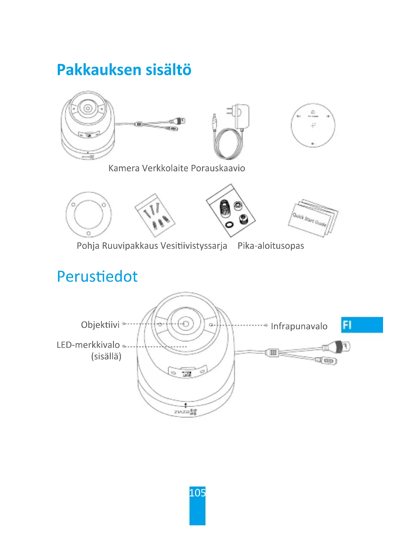 Løsn drejeknappen. Drej kameraet som vist i guren. Find nærmere oplysninger ved at besøge www.ezvizlife.com.105 Kamera Verkkolaite Porauskaavio Pohja Ruuvipakkaus Vesiivistyssarja Pika-aloitusopas Perusedot LED-merkkivalo (sisällä) Infrapunavalo Objekivi Pakkauksen sisältö106 NOLLAUS-painike MicroSD-korpaikka Verkkoliitäntä Virtaliitäntä Nimi Kuvaus Infrapunavalo Infrapunavalo syyy automaases huonoissa valaistusolosuhteissa, jolloin kuva näkyy selkeämmin. LED-merkkivalo • Tasaises palava punainen: kamera käynnistyy.