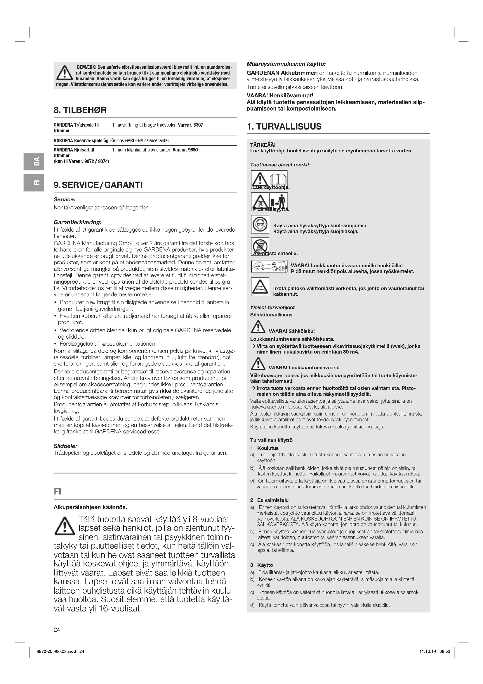 Määräystenmukainen käyttö: GARDENAN Akkutrimmeri on tarkoitettu nurmikon ja nurmialueiden viimeistelyyn ja leikkaukseen yksityisissä koti- ja harrastuspuutarhoissa. Tuote ei sovellu pitkäaikaiseen käyttöön. VAARA! Henkilövammat! Älä käytä tuotetta pensasaitojen leikkaamiseen, materiaalien silp- puamiseen tai kompostoimiseen. 9870-20.960.03.indd 24 11.10.19 08:53FI