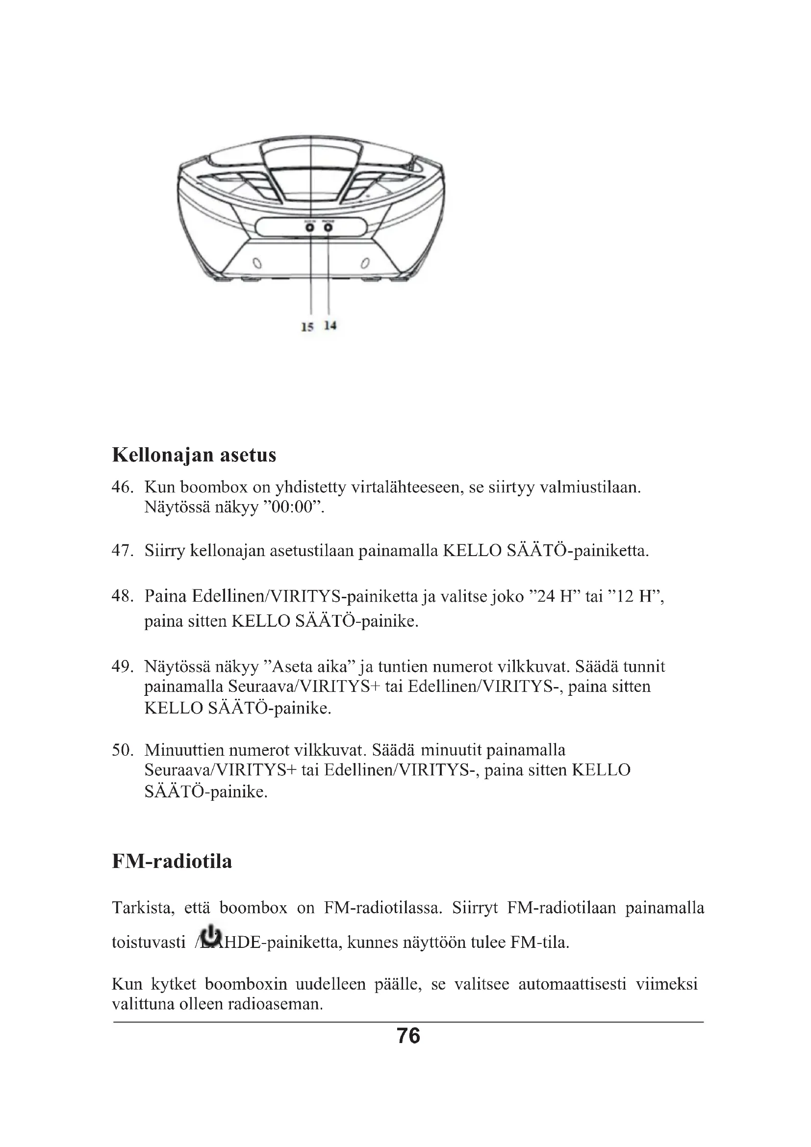 FM-radiotila Tarkista, että boombox on FM-radiotilassa. Siirryt FM-radiotilaan painamalla toistuvasti /LÄHDE-painiketta, kunnes näyttöön tulee FM-tila. Kun kytket boomboxin uudelleen päälle, se valitsee automaattisesti viimeksi valittuna olleen radioaseman.77