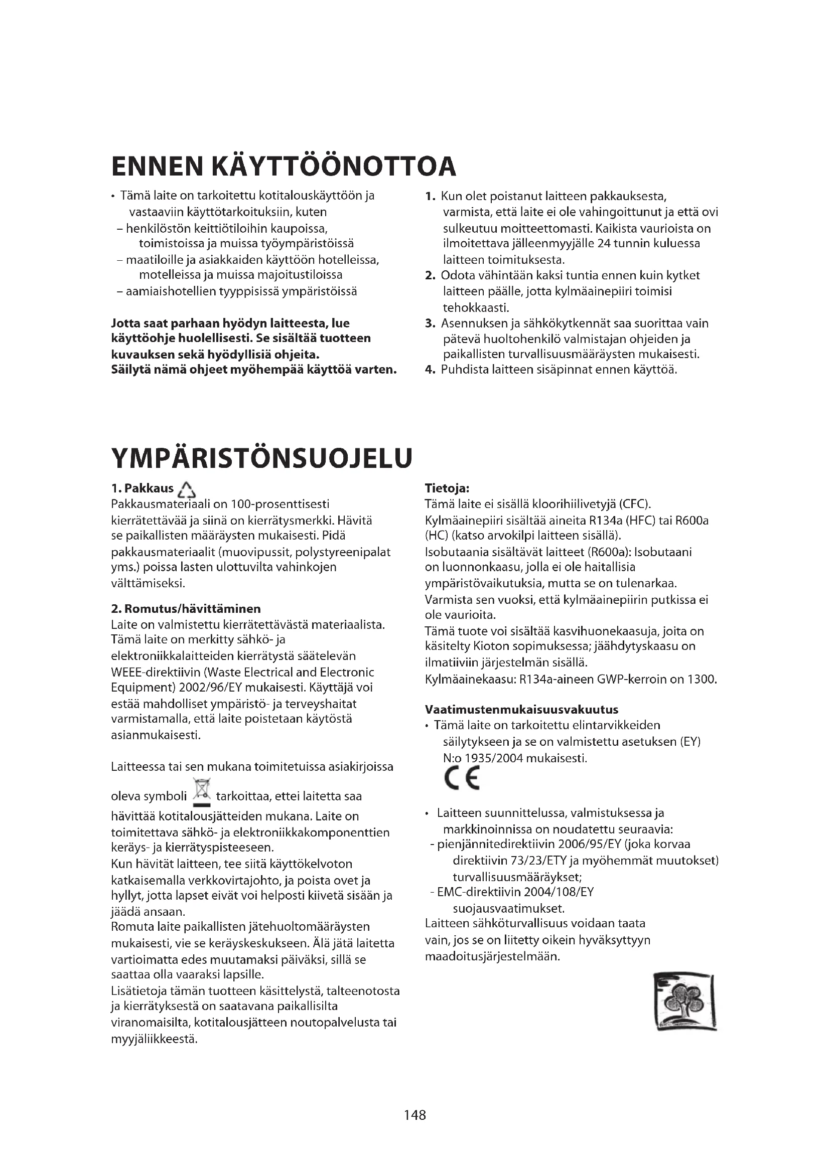 Laite on valmistettu kierrätettävästä materiaalista. Tämä laite on merkitty sähkö- ja elektroniikkalaitteiden kierrätystä säätelevän WEEE-direktiivin (Waste Electrical and Electronic Equipment) 2002/96/EY mukaisesti. Käyttäjä voi estää mahdolliset ympäristö- ja terveyshaitat varmistamalla, että laite poistetaan käytöstä asianmukaisesti. Laitteessa tai sen mukana toimitetuissa asiakirjoissa oleva symboli tarkoittaa, ettei laitetta saa hävittää kotitalousjätteiden mukana. Laite on toimitettava sähkö- ja elektroniikkakomponenttien keräys- ja kierrätyspisteeseen. Kun hävität laitteen, tee siitä käyttökelvoton katkaisemalla verkkovirtajohto, ja poista ovet ja hyllyt, jotta lapset eivät voi helposti kiivetä sisään ja jäädä ansaan. Romuta laite paikallisten jätehuoltomääräysten mukaisesti, vie se keräyskeskukseen. Älä jätä laitetta vartioimatta edes muutamaksi päiväksi, sillä se saattaa olla vaaraksi lapsille. Lisätietoja tämän tuotteen käsittelystä, talteenotosta ja kierrätyksestä on saatavana paikallisilta viranomaisilta, kotitalousjätteen noutopalvelusta tai myyjäliikkeestä. Tietoja: Tämä laite ei sisällä kloorihiilivetyjä (CFC). Kylmäainepiiri sisältää aineita R134a (HFC) tai R600a (HC) (katso arvokilpi laitteen sisällä). Isobutaania sisältävät laitteet (R600a): Isobutaani on luonnonkaasu, jolla ei ole haitallisia ympäristövaikutuksia, mutta se on tulenarkaa. Varmista sen vuoksi, että kylmäainepiirin putkissa ei ole vaurioita. Tämä tuote voi sisältää kasvihuonekaasuja, joita on käsitelty Kioton sopimuksessa; jäähdytyskaasu on ilmatiiviin järjestelmän sisällä. Kylmäainekaasu: R134a-aineen GWP-kerroin on 1300. Vaatimustenmukaisuusvakuutus