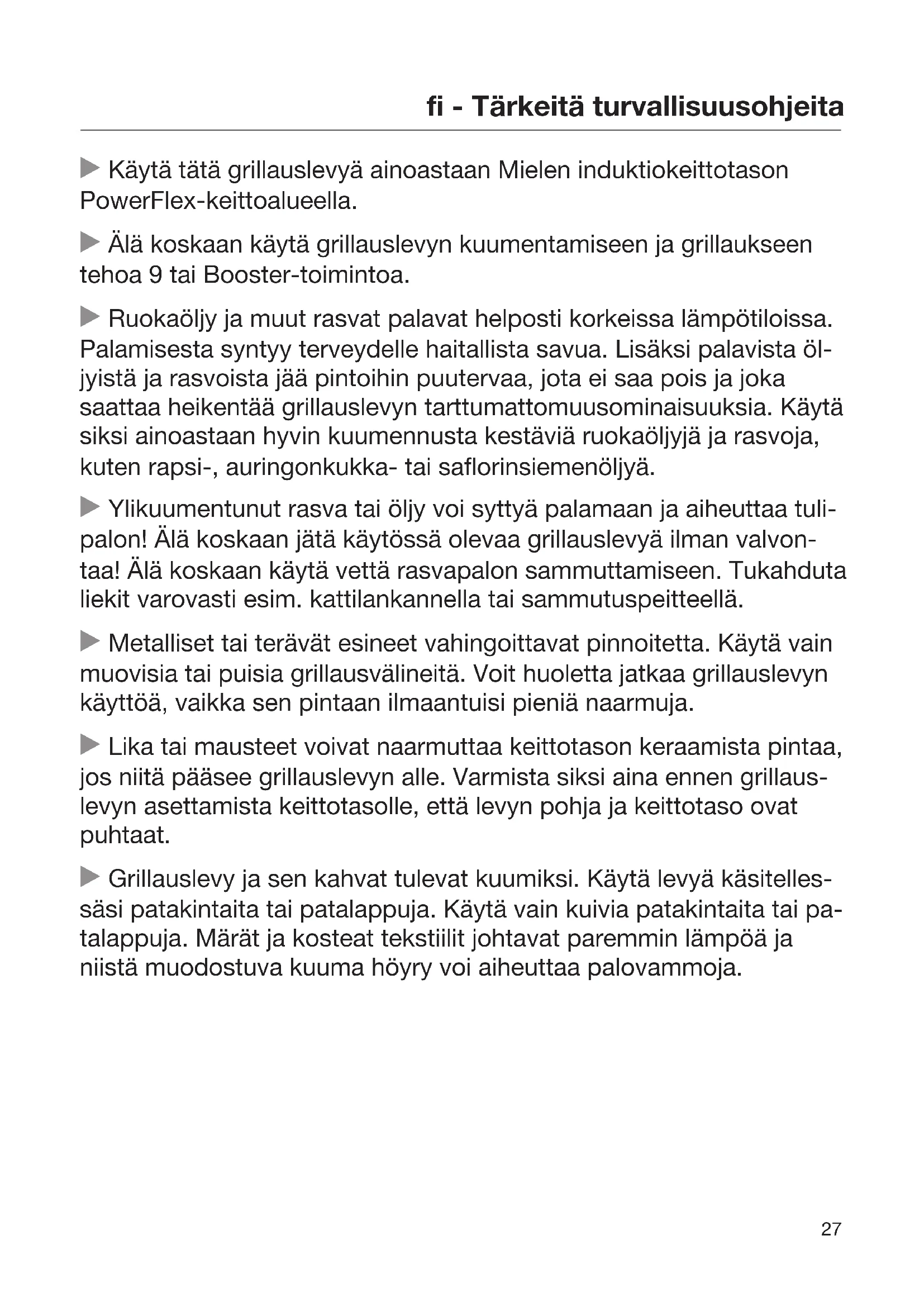 Käytä tätä grillauslevyä ainoastaan Mielen induktiokeittotason PowerFlex-keittoalueella. Älä koskaan käytä grillauslevyn kuumentamiseen ja grillaukseen tehoa9 tai Booster-toimintoa. Ruokaöljy ja muut rasvat palavat helposti korkeissa lämpötiloissa. Palamisesta syntyy terveydelle haitallista savua. Lisäksi palavista öl- jyistä ja rasvoista jää pintoihin puutervaa, jota ei saa pois ja joka saattaa heikentää grillauslevyn tarttumattomuusominaisuuksia. Käytä siksi ainoastaan hyvin kuumennusta kestäviä ruokaöljyjä ja rasvoja, kuten rapsi-, auringonkukka- tai saflorinsiemenöljyä. Ylikuumentunut rasva tai öljy voi syttyä palamaan ja aiheuttaa tuli- palon! Älä koskaan jätä käytössä olevaa grillauslevyä ilman valvon- taa! Älä koskaan käytä vettä rasvapalon sammuttamiseen. Tukahduta liekit varovasti esim. kattilankannella tai sammutuspeitteellä. Metalliset tai terävät esineet vahingoittavat pinnoitetta. Käytä vain muovisia tai puisia grillausvälineitä. Voit huoletta jatkaa grillauslevyn käyttöä, vaikka sen pintaan ilmaantuisi pieniä naarmuja. Lika tai mausteet voivat naarmuttaa keittotason keraamista pintaa, jos niitä pääsee grillauslevyn alle. Varmista siksi aina ennen grillaus- levyn asettamista keittotasolle, että levyn pohja ja keittotaso ovat puhtaat. Grillauslevy ja sen kahvat tulevat kuumiksi. Käytä levyä käsitelles- säsi patakintaita tai patalappuja. Käytä vain kuivia patakintaita tai pa- talappuja. Märät ja kosteat tekstiilit johtavat paremmin lämpöä ja niistä muodostuva kuuma höyry voi aiheuttaa palovammoja.fi - Pidä huolta ympäristöstäsi