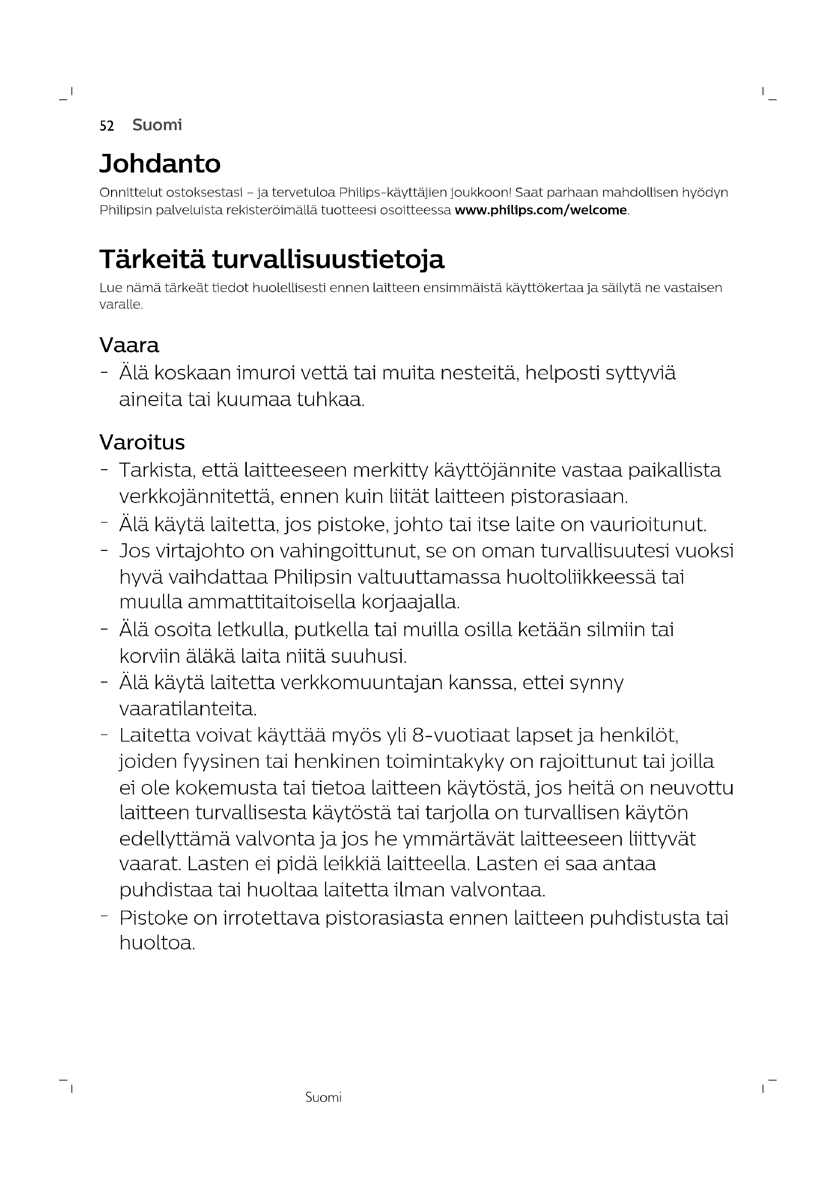PortuguêsSuomi Johdanto Onnittelut ostoksestasi – ja tervetuloa Philips-käyttäjien joukkoon! Saat parhaan mahdollisen hyödynPhilipsin palveluista rekisteröimällä tuotteesi osoitteessa www.philips.com/welcome. Tärkeitä turvallisuustietoja Lue nämä tärkeät tiedot huolellisesti ennen laitteen ensimmäistä käyttökertaa ja säilytä ne vastaisenvaralle. Vaara