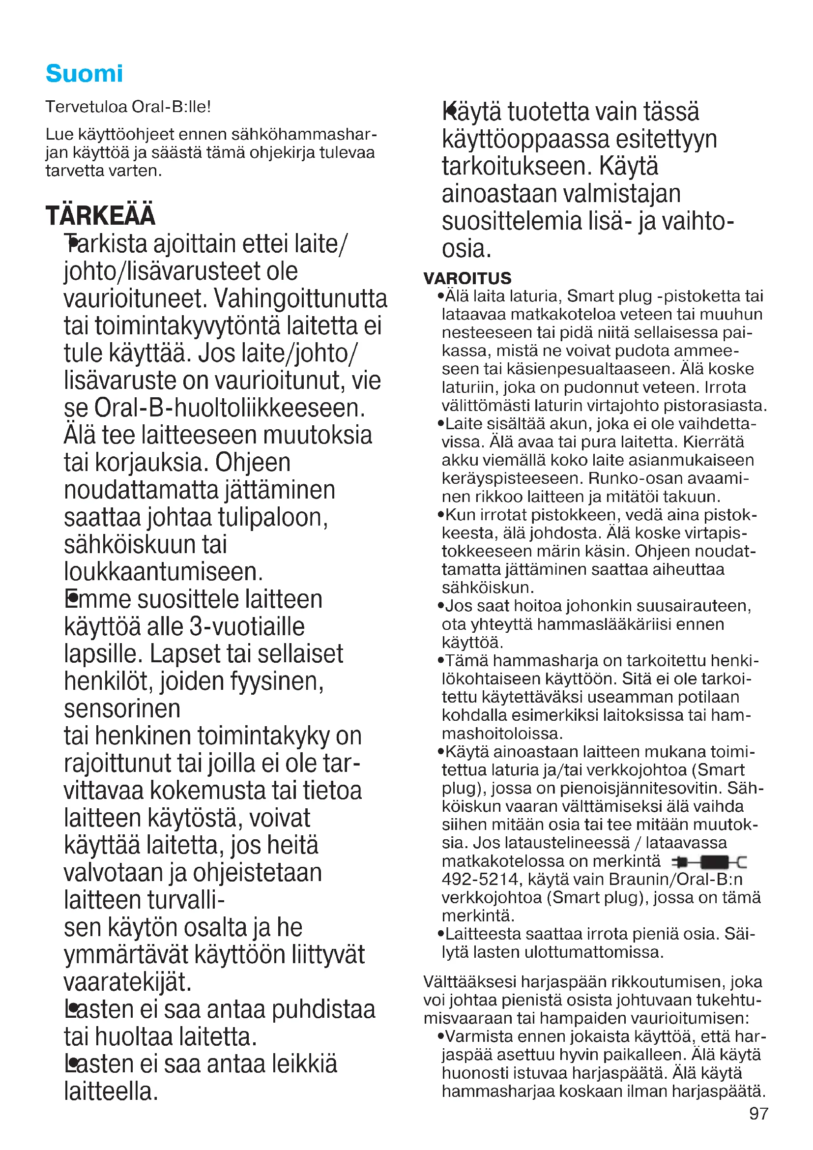 Tarkista ajoittain ettei laite/ johto/lisävarusteet ole vaurioituneet. Vahingoittunutta tai toimintakyvytöntä laitetta ei tule käyttää. Jos laite/johto/ lisävaruste on vaurioitunut, vie se Oral-B-huoltoliikkeeseen. Älä tee laitteeseen muutoksia tai korjauksia. Ohjeen noudattamatta jättäminen saattaa johtaa tulipaloon, sähköiskuun tai loukkaantumiseen.