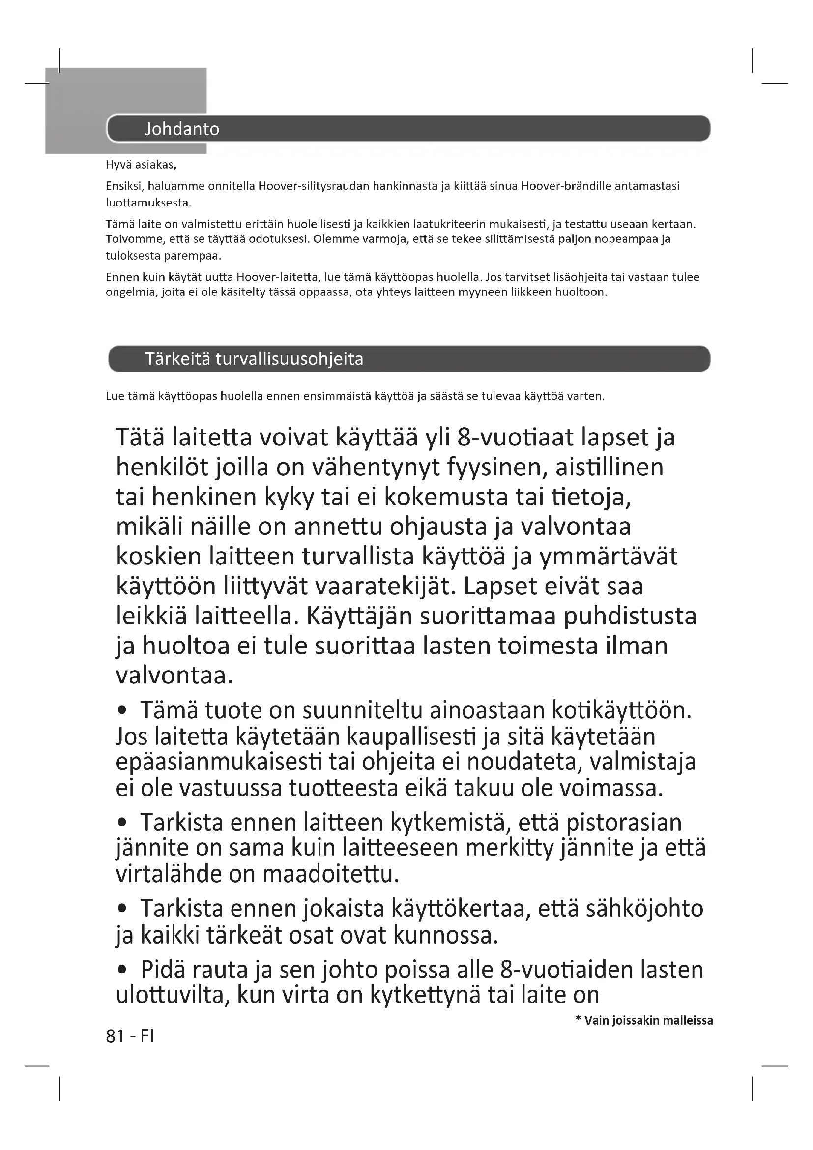 - Vain joissakin malleissa Johdanto Hyvä asiakas, Ensiksi, haluamme onnitella Hoover-silitysraudan hankinnasta ja kiiää sinua Hoover-brändille antamastasi luoamuksesta. Tämä laite on valmisteu eriäin huolellises ja kaikkien laatukriteerin mukaises, ja testau useaan kertaan. Toivomme, eä se täyää odotuksesi. Olemme varmoja, eä se tekee siliämisestä paljon nopeampaa ja tuloksesta parempaa. Ennen kuin käytät uua Hoover-laitea, lue tämä käyöopas huolella. Jos tarvitset lisäohjeita tai vastaan tulee ongelmia, joita ei ole käsitelty tässä oppaassa, ota yhteys laieen myyneen liikkeen huoltoon. Tärkeitä turvallisuusohjeita Lue tämä käyöopas huolella ennen ensimmäistä käyöä ja säästä se tulevaa käyöä varten. Tätä laitea voivat käyää yli 8-vuoaat lapset ja henkilöt joilla on vähentynyt fyysinen, aisllinen tai henkinen kyky tai ei kokemusta tai etoja, mikäli näille on anneu ohjausta ja valvontaa koskien laieen turvallista käyöä ja ymmärtävät käyöön liiyvät vaaratekijät. Lapset eivät saa leikkiä laieella. Käyäjän suoriamaa puhdistusta ja huoltoa ei tule suoriaa lasten toimesta ilman valvontaa.