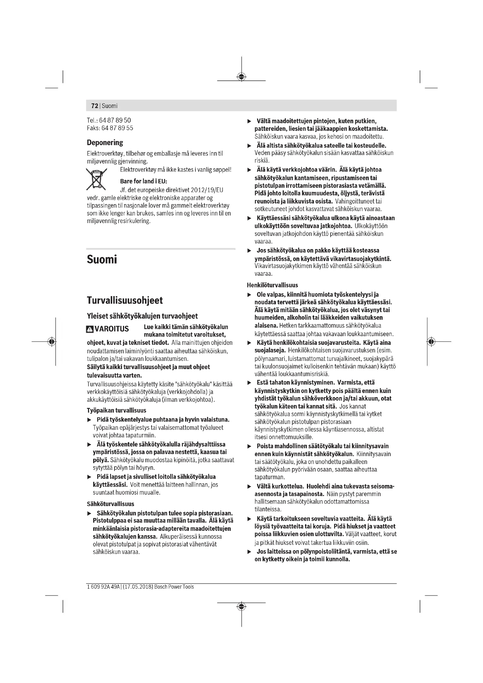 Hiomapaperin vaihtaminen (katso kuva A) Kun haluat irrottaa hiomapaperin (10), nosta sitä reunasta ja vedä se irti hiomalautaselta (8). Poista lika ja pöly hiomalautaselta (8) esimerkiksi siveltimellä, ennen kuin asennat uuden hiomapaperin. Hiomalautanen (8) on varustettu tarrakiinnityspinnalla, joka mahdollistaa tarrakiinnitteisen hiomapaperin nopean ja helpon asennuksen. Paina hiomapaperi (10) kunnolla kiinni hiomalautasen (8) pintaan. Tarkasta optimaalisen pölynpoiston varmistamiseksi, että hiomapaperin reiät ovat kohdakkain hiomalautasen reikien kanssa. Hiomalautasen valinta Sähkötyökalun voi varustaa käyttökohteen mukaan erikovuisilla hiomalautasilla: – Erittäin pehmeä hiomalautanen: soveltuu kiillotukseen ja tarkkaan hiontaan, myös kaarevilla pinnoilla. – Pehmeä hiomalautanen: soveltuu kaikkiin hiomatöihin, yleiskäyttöinen. – Kova hiomalautanen: soveltuu tasopintojen tehokkaaseen hiontaan. Suomi | 75 Bosch Power Tools 1 609 92A 49A | (17.05.2018)76 | Suomi 1 609 92A 49A | (17.05.2018) Bosch Power Tools Hiomalautasen vaihtaminen (katso kuvaB) Huomautus: vaihda viallinen hiomalautanen (8) välittömästi. Vedä hiomapyörö tai kiillotustarvike irti. Kierrä ruuvi (11) irti ja ota hiomalautanen (8) pois. Asenna uusi hiomalautanen (8) paikalleen ja kiristä ruuvi. Huomautus: varmista hiomalautasen asennuksessa, että vääntiön hammastus tarttuu hiomalautasen uriin. Huomautus: hiomalautasen viallisen kannattimen saa vaihtaa vain valtuutettu Bosch-sähkötyökalujen huoltokorjaamo. Pölyn-/purunpoisto Työstettävistä materiaaleista syntyvä pöly (esimerkiksi lyijypitoinen pinnoite, tietyt puulaadut, kivi ja metalli) voi olla terveydelle vaarallista. Pölyn koskettaminen tai hengittäminen saattaa aiheuttaa käyttäjälle tai lähellä oleville henkilöille allergisia reaktioita ja/tai hengitystiesairauksia. Tiettyjen pölylaatujen (esimerkiksi tammi- tai pyökkipöly) katsotaan aiheuttavan syöpää, varsikin puunsuojaukseen käytettävien lisäaineiden yhteydessä (kromaatti, puunsuoja- aine). Asbestipitoisia materiaaleja saavat käsitellä vain asiantuntevat ammattilaiset. – Käytä mahdollisuuksien mukaan materiaalille soveltuvaa pölynpoistoa. – Huolehdi työkohteen hyvästä tuuletuksesta. – Suosittelemme käyttämään suodatusluokan P2 hengityssuojanaamaria. Noudata käsiteltäviä materiaaleja koskevia maakohtaisia määräyksiä. u Estä pölyn kertyminen työpisteeseen. Pöly saattaa olla herkästi syttyvää. Pölynpoisto koneen omaan pölysäiliöön (katso kuvat C–