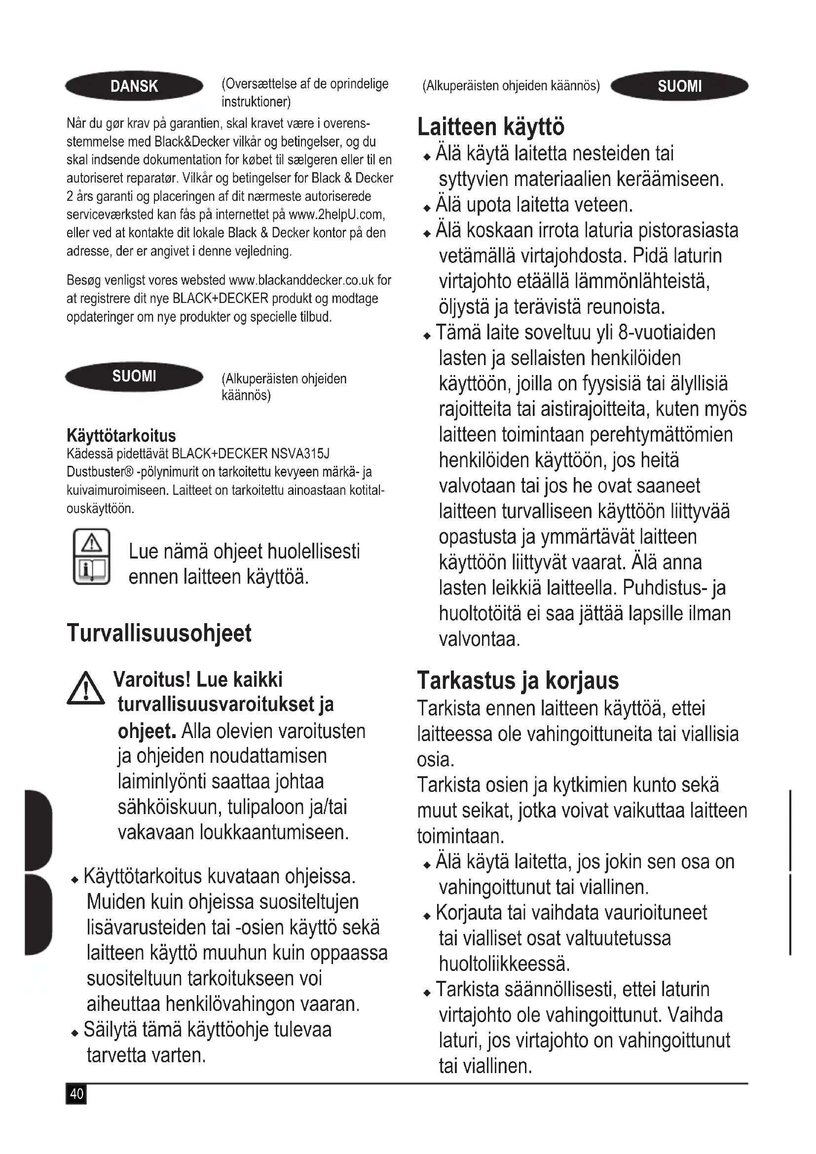 Takuu Black & Decker on vakuuttunut tuotteidensa korkeasta laadusta ja tarjoaa kuluttajille 24 kuukauden takuun, joka astuu voimaan ostopäivänä. Kyseinen takuu75 on lisäys kuluttajan laillisiin oikeuksiin eikä vaikuta niihin. Tämä takuu on voimassa kaikissa EU- ja ETA-maissa. Edellytyksenä takuun saamiselle on, että vaade täyttää Black & Deckerin ehdot ja että ostaja toimittaa ostotositteen jälleen-myyjälle tai valtuutetulle huoltoliikkeelle. Black & Deckerin kahden vuoden takuun ehdot ja lähimmän valtuutetun korjaus-palvelun yhteystiedot ovat saatavilla osoitteessa www.2helpU.com tai ottamalla yhteyttä paikalliseen Black & Deckerin toimipisteeseen tässä ohjekirjassa ilmoitettuihin osoitteisiin. Käy verkkosivuillamme osoitteessa www.blackanddecker. ja rekisteröi uusi BLACK+DECKER -tuotteesi saadaksesi tietoa uusista tuotteista ja erikoistarjouksista.(Μετάφραση των πρωτότυπων οδηγιών)Προβλεπόμενη χρήση Τα ηλεκτρικά σκουπάκια χειρός BLACK+DECKER NSVA315J Dustbuster® έχουν σχεδιαστεί για ελαφριές χρήσεις σκουπίσματος υγρών και στεγνών επιφανειών. Αυτές οι συσκευές προορίζονται μόνο για οικιακή χρήση. Διαβάστε προσεκτικά όλο το περιεχόμενο αυτού του εγχειριδίου πριν χρησιμοποιήσετε τη συσκευή. Οδηγίες ασφαλείας