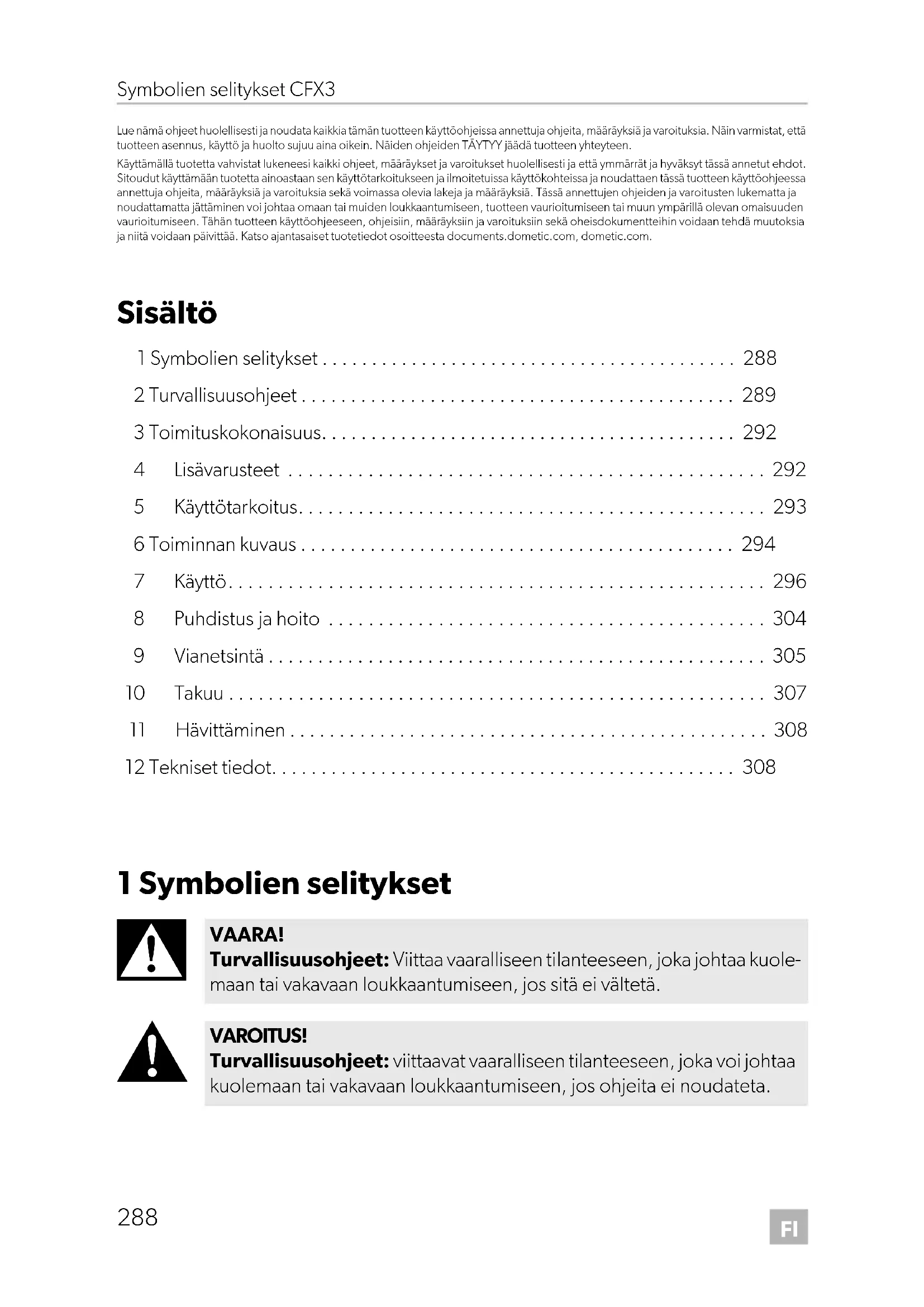 - Lue nämä ohjeet huolellisesti ja noudata kaikkia tämän tuotteen käyttöohjeissa annettuja ohjeita, määräyksiä ja varoituksia. Näin varmistat, että tuotteen asennus, käyttö ja huolto sujuu aina oikein. Näiden ohjeiden TÄYTYY jäädä tuotteen yhteyteen. Käyttämällä tuotetta vahvistat lukeneesi kaikki ohjeet, määräykset ja varoitukset huolellisesti ja että ymmärrät ja hyväksyt tässä annetut ehdot. Sitoudut käyttämään tuotetta ainoastaan sen käyttötarkoitukseen ja ilmoitetuissa käyttökohteissa ja noudattaen tässä tuotteen käyttöohjeessa annettuja ohjeita, määräyksiä ja varoituksia sekä voimassa olevia lakeja ja määräyksiä. Tässä annettujen ohjeiden ja varoitusten lukematta ja noudattamatta jättäminen voi johtaa omaan tai muiden loukkaantumiseen, tuotteen vaurioitumiseen tai muun ympärillä olevan omaisuuden vaurioitumiseen. Tähän tuotteen käyttöohjeeseen, ohjeisiin, määräyksiin ja varoituksiin sekä oheisdokumentteihin voidaan tehdä muutoksia ja niitä voidaan päivittää. Katso ajantasaiset tuotetiedot osoitteesta documents.dometic.com, dometic.com. Sisältö 1 Symbolien selitykset p. 288