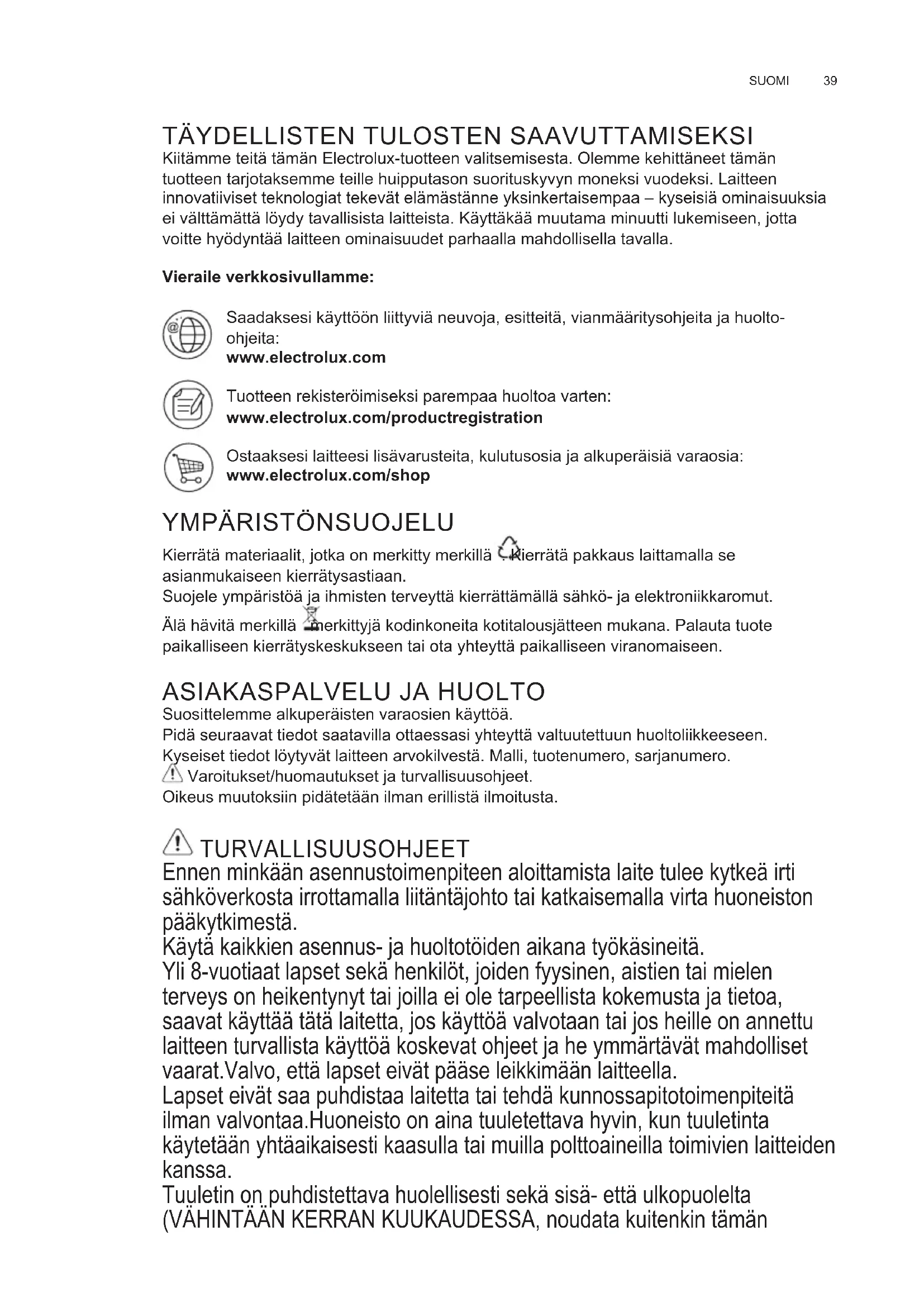 Kiitämme teitä tämän Electrolux-tuotteen valitsemisesta. Olemme kehittäneet tämän tuotteen tarjotaksemme teille huipputason suorituskyvyn moneksi vuodeksi Laitteen innovatiiviset teknologiat tekevät elämästänne yksinkertaisempaa – kyseisiä ominaisuuksia ei välttämättä löydy tavallisista laitteista. Käyttäkää muutama minuutti lukemiseen, jotta voitte hyödyntää laitteen ominaisuudet parhaalla mahdollisella tavalla. Vieraile verkkosivullamme: Saadaksesi käyttöön liittyviä neuvoja, esitteitä, vianmääritysohjeita ja huolto- ohjeita: www.electrolux.com Tuotteen rekisteröimiseksi parempaa huoltoa varten: www.electrolux.com/productregistration Ostaaksesi laitteesi lisävarusteita, kulutusosia ja alkuperäisiä varaosia: www.electrolux.com/shop