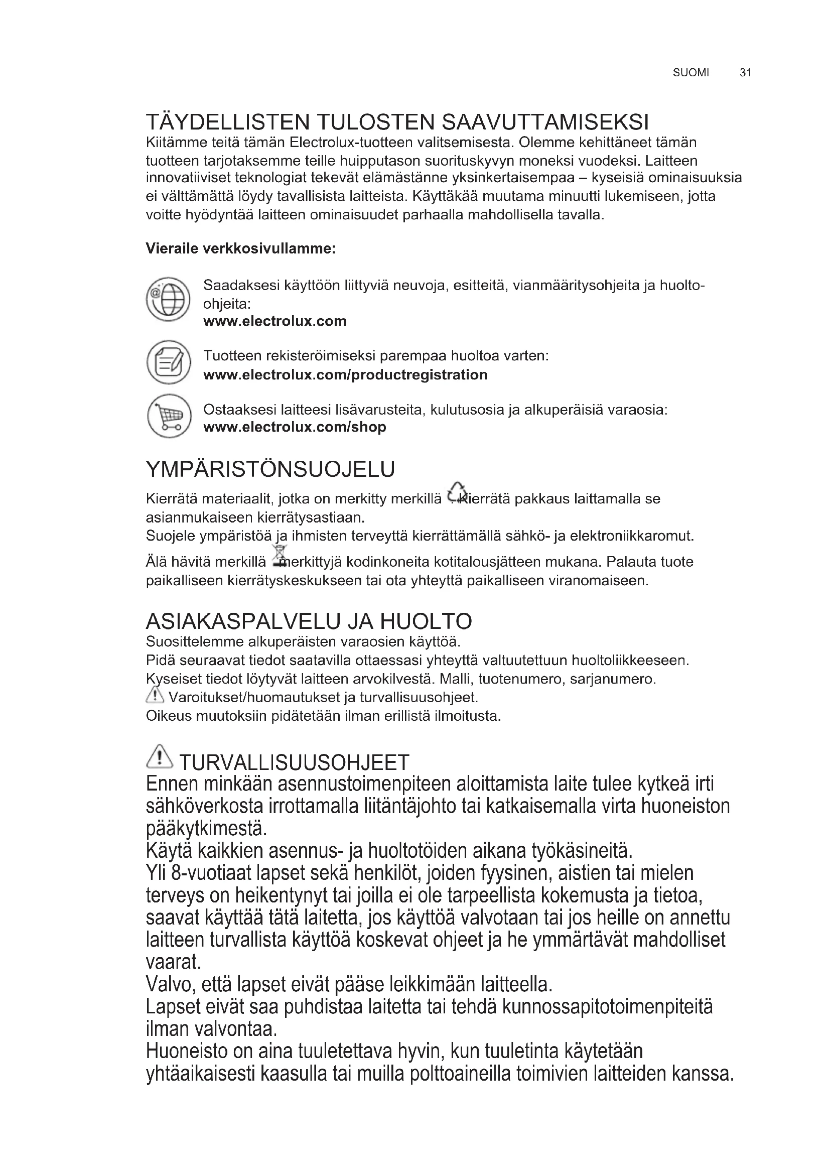 Kiitämme teitä tämän Electrolux-tuotteen valitsemisesta. Olemme kehittäneet tämän tuotteen tarjotaksemme teille huipputason suorituskyvyn moneksi vuodeksi Laitteen innovatiiviset teknologiat tekevät elämästänne yksinkertaisempaa – kyseisiä ominaisuuksia ei välttämättä löydy tavallisista laitteista. Käyttäkää muutama minuutti lukemiseen, jotta voitte hyödyntää laitteen ominaisuudet parhaalla mahdollisella tavalla. Vieraile verkkosivullamme: Saadaksesi käyttöön liittyviä neuvoja, esitteitä, vianmääritysohjeita ja huolto- ohjeita: www.electrolux.com Tuotteen rekisteröimiseksi parempaa huoltoa varten: www.electrolux.com/productregistration Ostaaksesi laitteesi lisävarusteita, kulutusosia ja alkuperäisiä varaosia: www.electrolux.com/shop