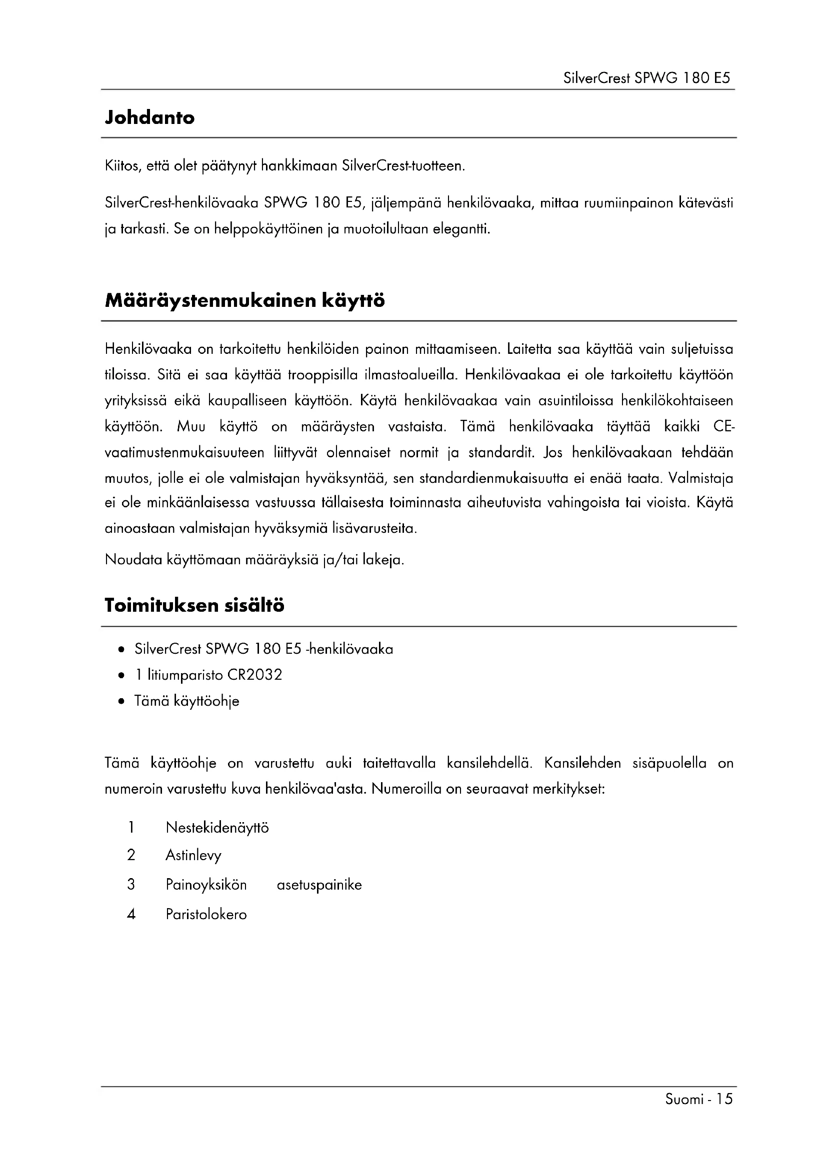 - Takuu ja huolto SilverCrest SPWG 180 E5 Suomi - 15 Johdanto Kiitos, että olet päätynyt hankkimaan SilverCrest-tuotteen. SilverCrest-henkilövaaka SPWG 180 E5, jäljempänä henkilövaaka, mittaa ruumiinpainon kätevästi ja tarkasti. Se on helppokäyttöinen ja muotoilultaan elegantti. Määräystenmukainen käyttö Henkilövaaka on tarkoitettu henkilöiden painon mittaamiseen. Laitetta saa käyttää vain suljetuissa tiloissa. Sitä ei saa käyttää trooppisilla ilmastoalueilla. Henkilövaakaa ei ole tarkoitettu käyttöön yrityksissä eikä kaupalliseen käyttöön. Käytä henkilövaakaa vain asuintiloissa henkilökohtaiseen käyttöön. Muu käyttö on määräysten vastaista. Tämä henkilövaaka täyttää kaikki CE- vaatimustenmukaisuuteen liittyvät olennaiset normit ja standardit. Jos henkilövaakaan tehdään muutos, jolle ei ole valmistajan hyväksyntää, sen standardienmukaisuutta ei enää taata. Valmistaja ei ole minkäänlaisessa vastuussa tällaisesta toiminnasta aiheutuvista vahingoista tai vioista. Käytä ainoastaan valmistajan hyväksymiä lisävarusteita. Noudata käyttömaan määräyksiä ja/tai lakeja. Toimituksen sisältö SilverCrest SPWG 180 E5 -henkilövaaka 1 litiumparisto CR2032 Tämä käyttöohje Tämä käyttöohje on varustettu auki taitettavalla kansilehdellä. Kansilehden sisäpuolella on numeroin varustettu kuva henkilövaa'asta. Numeroilla on seuraavat merkitykset: 1 Nestekidenäyttö 2 Astinlevy 3 Painoyksikön asetuspainike 4 ParistolokeroSilverCrest SPWG 180 E5 p. 24
