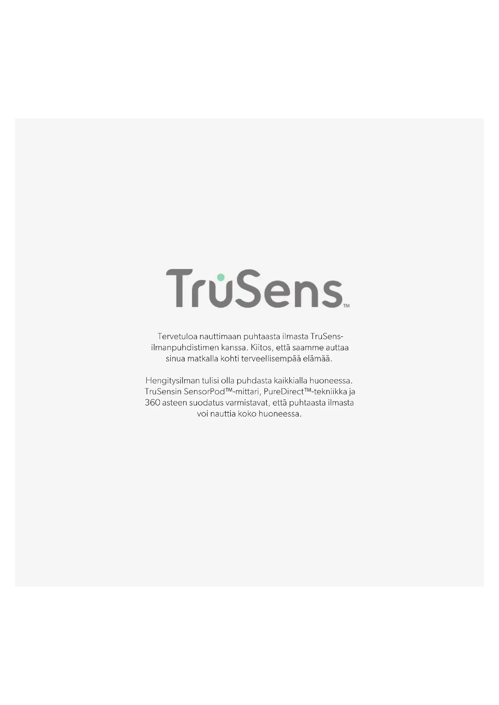 :n kokoiseen huoneeseen.146 OHJAUSPANEELI Tuulettimen nopeusasetukset Valitse tuulettimen nopeus tai AUTO-tila. AUTO-tilassa puhdistin säätää tuulettimen nopeutta automaattisesti SensorPod-mittarin ilmanlaatulukemien perusteella. Ajastintila Puhdistin sammuu automaattisesti 2, 4, 8 tai 12 tunnin kuluttua. Voit peruuttaa tämän ajastuksen painamalla painiketta, kunnes ajastinaikaa ei näy. UV-tila Puhdistimen suodatinkammion UV-C-lamppu on päällä, kun symboli on valkoinen. Symboli palaa punaisena, kun UV-C-lamppu on vaihdettava uuteen. Suodattimien ja UV-lampun merkkivalojen nollaus “HEPA”-, “Carbon”- ja “UV”-merkkivalot palavat punaisina, kun ne on aika vaihtaa uusiin. Kun yksi merkkivaloista palaa, sen voi nollata pitämällä Reset (nollaus) -painiketta painettuna kolmen sekunnin ajan. Kun vähintään kaksi merkkivaloa palaa, valitse ensin merkkivalo napauttamalla Reset (nollaus) -painiketta (valittu merkkivalo vilkkuu), ja nollaa sitten merkkivalo pitämällä painiketta painettuna kolmen sekunnin ajan. Yötila Näytön valaistus sammuu helpottamaan nukkumista, mutta puhdistimen toiminta jatkuu. Voit palauttaa näytön ominaisuudet näkyviin painamalla painiketta uudelleen. Virtapainike (AUTO-tila on käytettävissä vain, kun puhdistin on yhdistetty SensorPod-mittariin ja vastaanottaa sen signaalia.) (Katso ohjeet sivulta 151). (Katso vaihto-ohjeet sivuilta 149–151. Nollaa merkkivalot yllä olevien ohjeiden mukaisesti suodattimen vaihtamisen jälkeen.)147 ILMANLAATUNÄYTTÖ Reaaliaikainen mittaus Ainutlaatuinen SensorPod™-mittari arvioi ilmanlaatua mittaamalla sekä pienten (PM2,5) että suurempien (PM10) hiukkasten määrää. Se laskee kokonaisilmanlaadun käyttämällä ainutlaatuista algoritmiamme, joka reagoi todellisiin epäpuhtauksiin, mutta ei ylireagoi esimerkiksi jonkun tullessa huoneeseen tai istahtaessa sohvalle. Valaistu ja värikoodattu näyttö ilmoittaa, onko ilmanlaatu hyvä, kohtalainen vai huono, ja numeroarvo kertoo siitä tarkemmin. AUTO-tilassa puhdistin säätää tuulettimen nopeutta automaattisesti näiden ilmanlaatulukemien perusteella. TruSens käyttää Yhdysvaltain ympäristönsuojeluviraston (EPA) ilmanlaatuindeksiä (1–500). HYVÄ SININEN | 0 - 50 KOHTALAINEN KELTAINEN | 50 - 100 HUONO PUNAINEN | 100 - 500148 Ilman tulo 360° Ilma vaihtuu kaksi kertaa tunnissa 70 m² Ilman tuottotapa PureDirect
