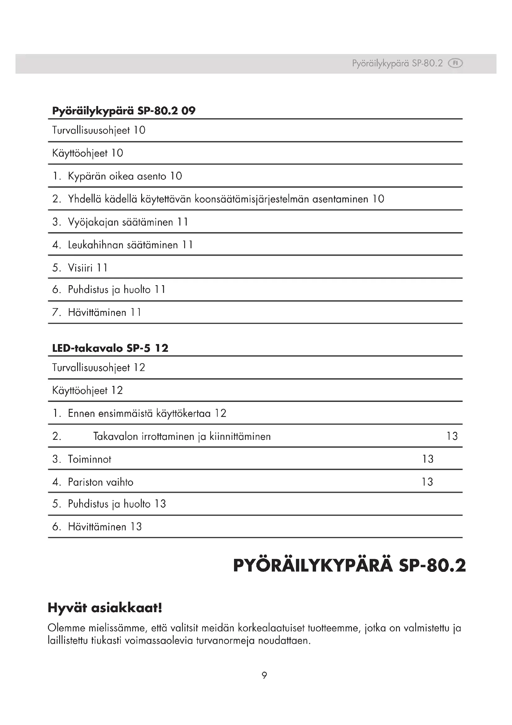 Hyvät asiakkaat! Olemme mielissämme, että valitsit meidän korkealaatuiset tuotteemme, jotka on valmistettu ja laillistettu tiukasti voimassaolevia turvanormeja noudattaen. Pyöräilykypärä SP-80.2 Pyöräilykypärä SP-80.2 09 Turvallisuusohjeet 10 Käyttöohjeet 10