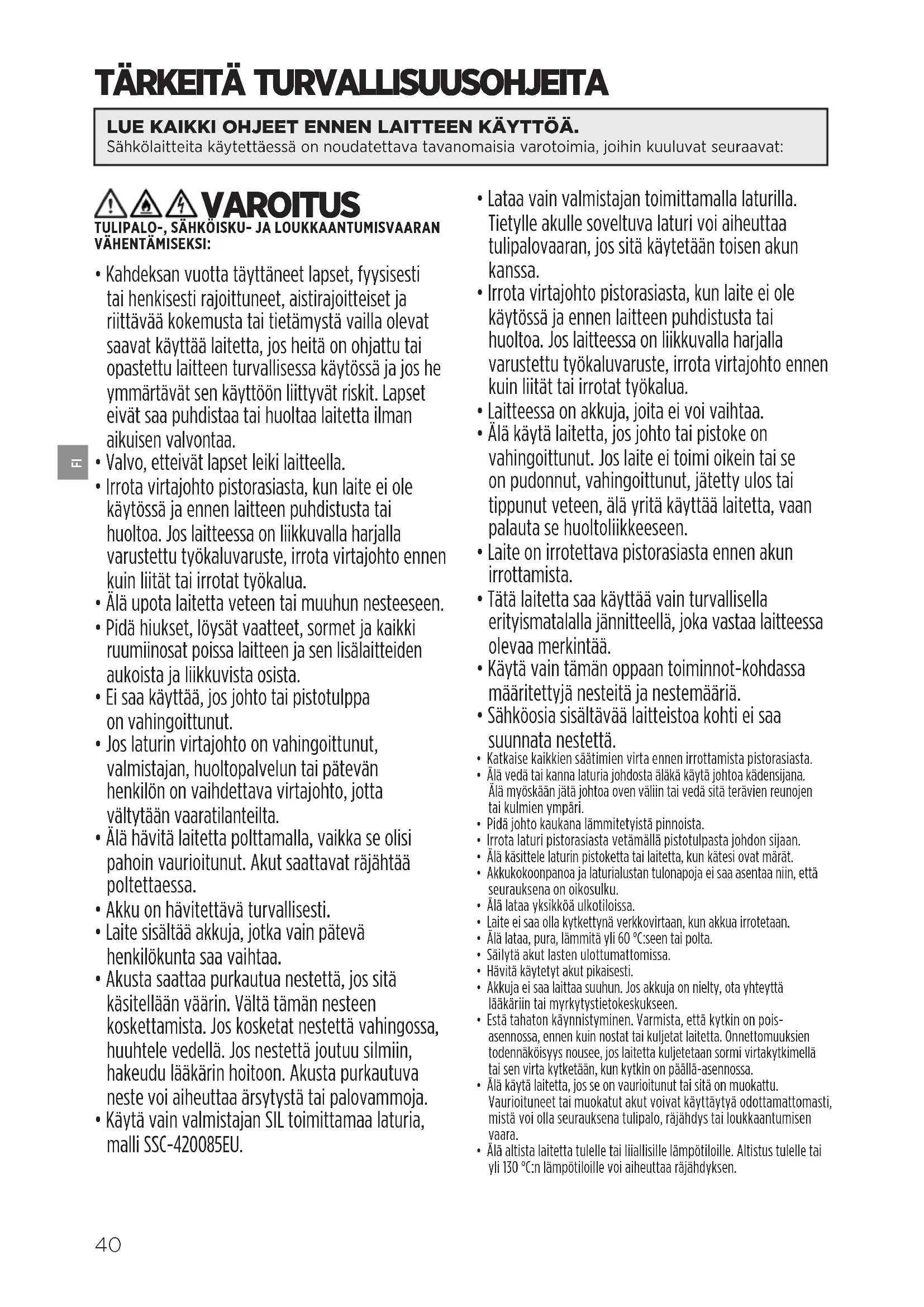 - Älä altista laitetta tulelle tai liiallisille lämpötiloille. Altistus tulelle tai yli 130 °C:n lämpötiloille voi aiheuttaa räjähdyksen. LUE KAIKKI OHJEET ENNEN LAITTEEN KÄYTTÖÄ. Sähkölaitteita käytettäessä on noudatettava tavanomaisia varotoimia, joihin kuuluvat seuraavat: