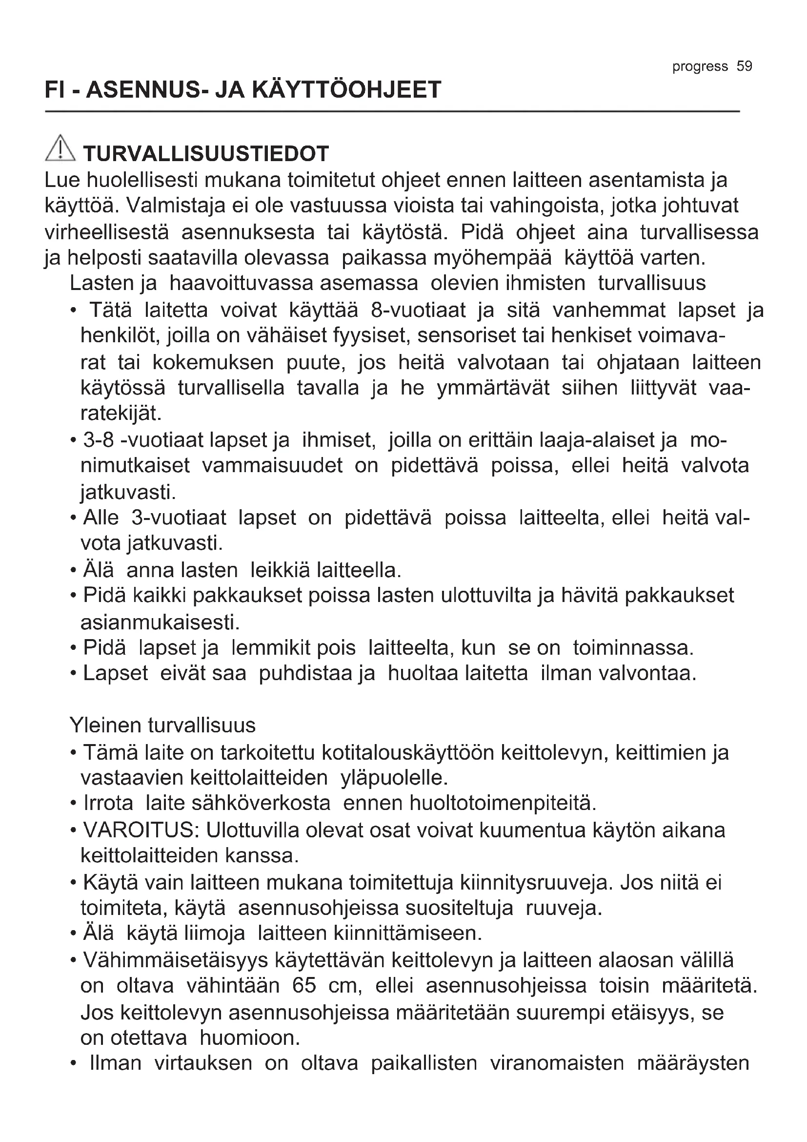 - Älä asenna poistoilmaa seinän onteloon,progress 61 ellei onteloa ole suunniteltu tähän tarkoi- tukseen. Tarkista sähköliitännät VAROITUS! Tulipalon ja sähköiskun vaara.