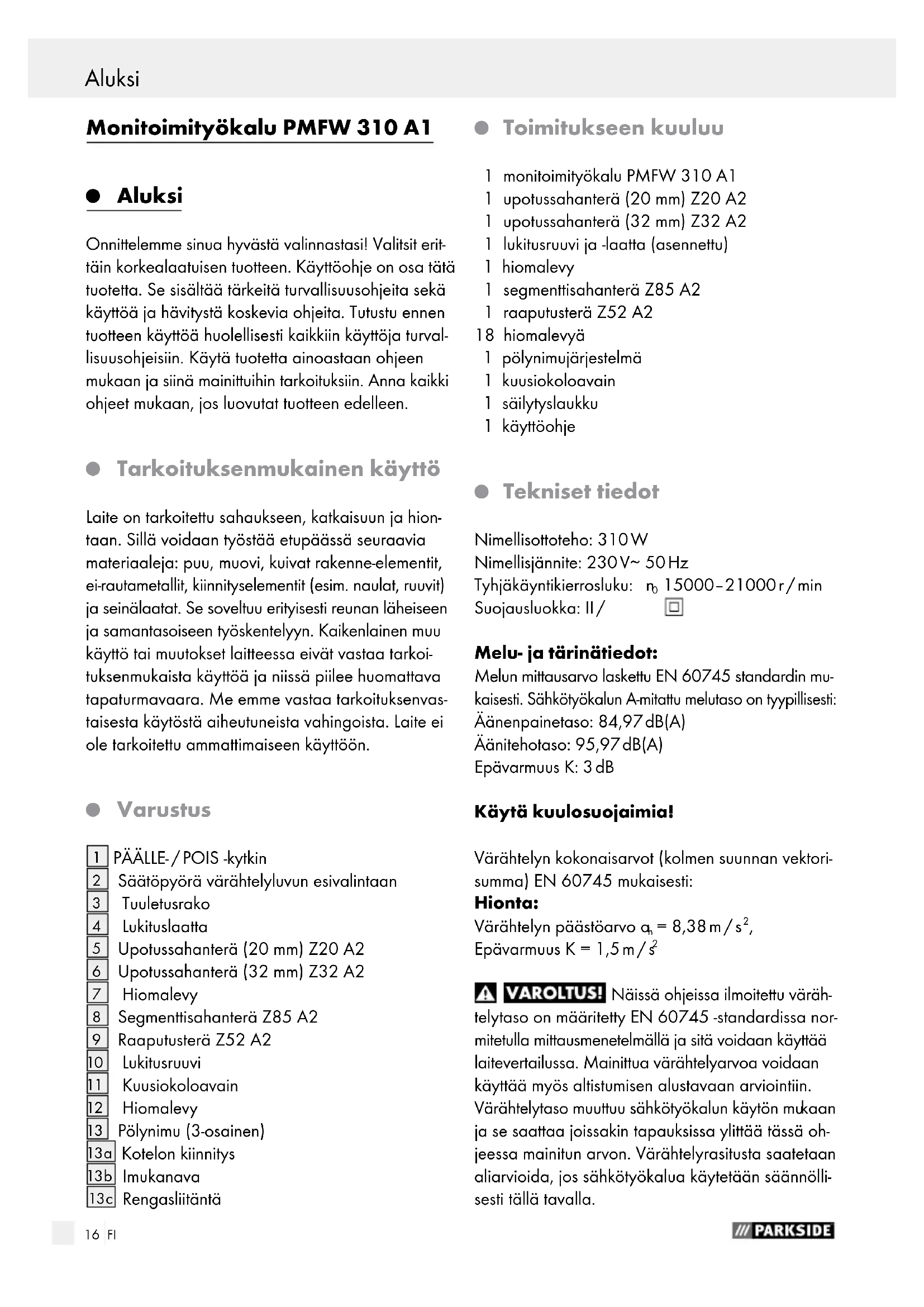 PMFW 310 A1 - Monitoimityökalut PARKSIDE - Ilmainen käyttöohje ja opas