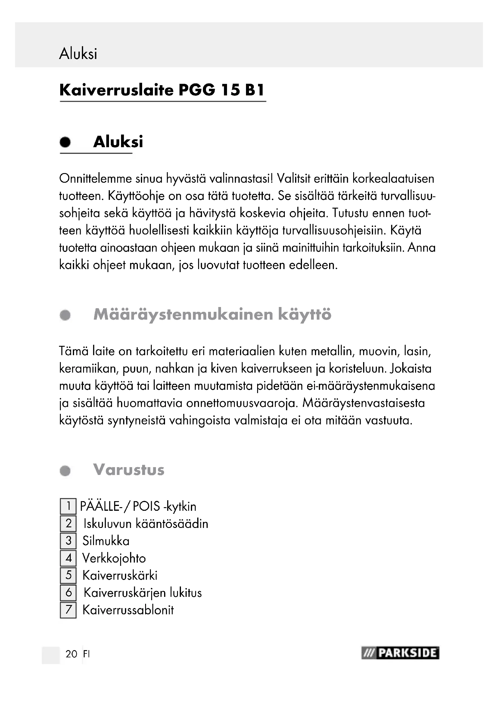 Käyttö Päälle- / poiskytkentä ................................................................Sivu 26 Iskusyvyyden säätäminen .........................................................Sivu 27 Kaiverruskärjen vaihto ..............................................................Sivu 27 Työohjeet ...................................................................................Sivu 28 Puhdistus ...............................................................................Sivu 28 Huolto.......................................................................................Sivu 28 Takuu ........................................................................................Sivu 29 Hävittäminen .....................................................................Sivu 30 Käännös alkuperäisestä EY-vaatimusten- mukaisuusvakuutuksesta / Valmistajan .....Sivu 3020 FI Aluksi Kaiverruslaite PGG 15 B1 Aluksi Onnittelemme sinua hyvästä valinnastasi! Valitsit erittäin korkealaatuisen tuotteen. Käyttöohje on osa tätä tuotetta. Se sisältää tärkeitä turvallisuu- sohjeita sekä käyttöä ja hävitystä koskevia ohjeita. Tutustu ennen tuot- teen käyttöä huolellisesti kaikkiin käyttöja turvallisuusohjeisiin. Käytä tuotetta ainoastaan ohjeen mukaan ja siinä mainittuihin tarkoituksiin. Anna kaikki ohjeet mukaan, jos luovutat tuotteen edelleen. Määräystenmukainen käyttö Tämä laite on tarkoitettu eri materiaalien kuten metallin, muovin, lasin, keramiikan, puun, nahkan ja kiven kaiverrukseen ja koristeluun. Jokaista muuta käyttöä tai laitteen muutamista pidetään ei-määräystenmukaisena ja sisältää huomattavia onnettomuusvaaroja. Määräystenvastaisesta käytöstä syntyneistä vahingoista valmistaja ei ota mitään vastuuta. Varustus