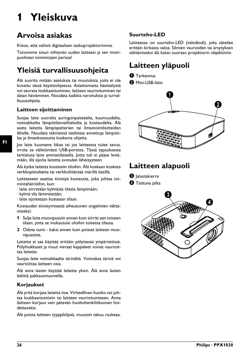 1 Yleiskuva Arvoisa asiakas Kiitos, että valitsit digitaalisen taskuprojektorimme. Toivomme sinun viihtyvän uuden laitteesi ja sen monipuolisten toimintojen parissa!