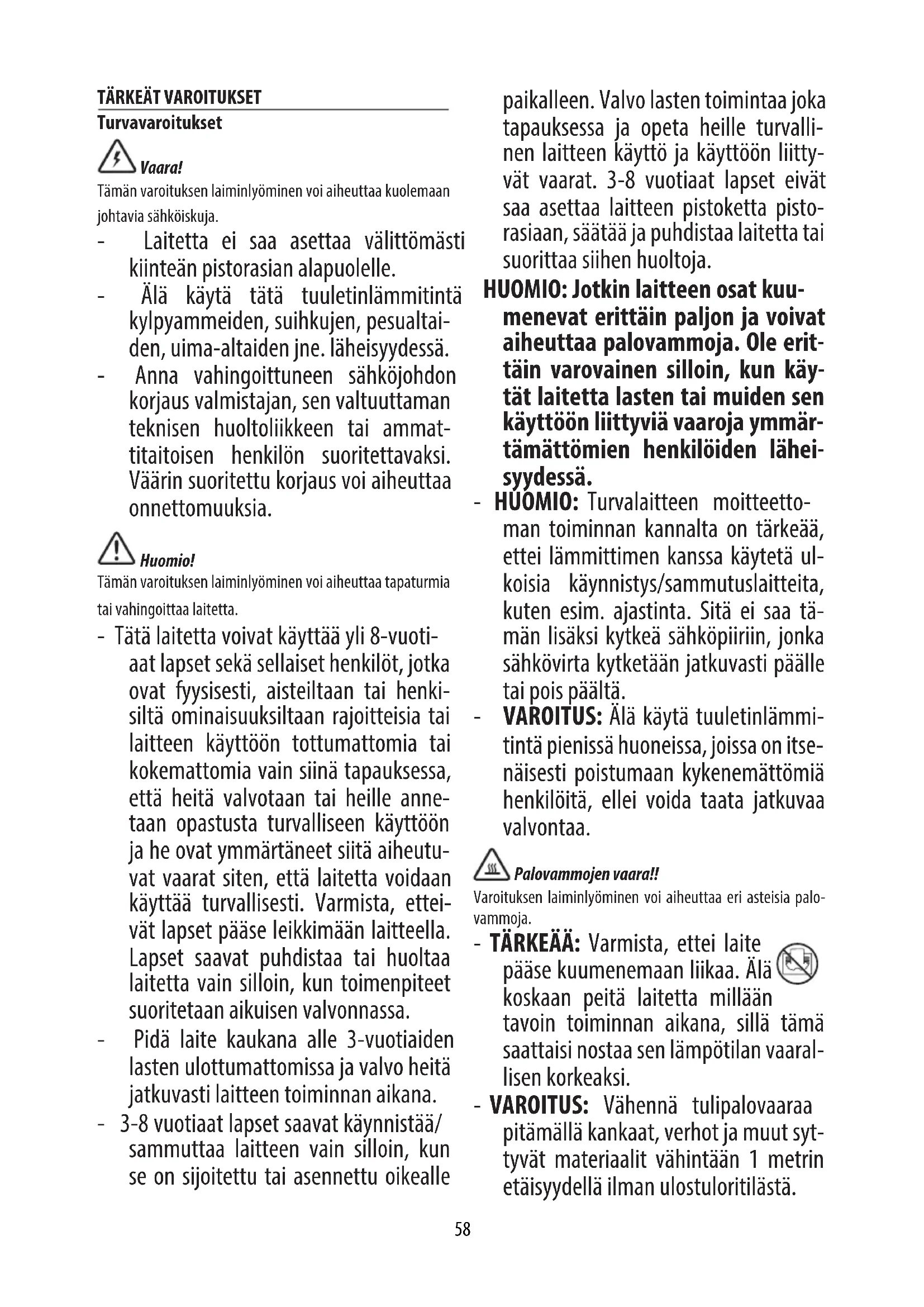 Turvavaroitukset Vaara! Tämän varoituksen laiminlyöminen voi aiheuttaa kuolemaan johtavia sähköiskuja. - Laitetta ei saa asettaa välittömästi kiinteän pistorasian alapuolelle. - Älä käytä tätä tuuletinlämmitintä kylpyammeiden, suihkujen, pesualtai- den, uima-altaiden jne. läheisyydessä. - Anna vahingoittuneen sähköjohdon korjaus valmistajan, sen valtuuttaman teknisen huoltoliikkeen tai ammat- titaitoisen henkilön suoritettavaksi. Väärin suoritettu korjaus voi aiheuttaa onnettomuuksia. Huomio! Tämän varoituksen laiminlyöminen voi aiheuttaa tapaturmia tai vahingoittaa laitetta. - Tätä laitetta voivat käyttää yli 8-vuoti- aat lapset sekä sellaiset henkilöt, jotka ovat fyysisesti, aisteiltaan tai henki- siltä ominaisuuksiltaan rajoitteisia tai laitteen käyttöön tottumattomia tai kokemattomia vain siinä tapauksessa, että heitä valvotaan tai heille anne- taan opastusta turvalliseen käyttöön ja he ovat ymmärtäneet siitä aiheutu- vat vaarat siten, että laitetta voidaan käyttää turvallisesti. Varmista, ettei- vät lapset pääse leikkimään laitteella. Lapset saavat puhdistaa tai huoltaa laitetta vain silloin, kun toimenpiteet suoritetaan aikuisen valvonnassa. - Pidä laite kaukana alle 3-vuotiaiden lasten ulottumattomissa ja valvo heitä jatkuvasti laitteen toiminnan aikana. - 3-8 vuotiaat lapset saavat käynnistää/ sammuttaa laitteen vain silloin, kun se on sijoitettu tai asennettu oikealle paikalleen. Valvo lasten toimintaa joka tapauksessa ja opeta heille turvalli- nen laitteen käyttö ja käyttöön liitty- vät vaarat. 3-8 vuotiaat lapset eivät saa asettaa laitteen pistoketta pisto- rasiaan, säätää ja puhdistaa laitetta tai suorittaa siihen huoltoja. HUOMIO: Jotkin laitteen osat kuu- menevat erittäin paljon ja voivat aiheuttaa palovammoja. Ole erit- täin varovainen silloin, kun käy- tät laitetta lasten tai muiden sen käyttöön liittyviä vaaroja ymmär- tämättömien henkilöiden lähei- syydessä. - HUOMIO: Turvalaitteen moitteetto- man toiminnan kannalta on tärkeää, ettei lämmittimen kanssa käytetä ul- koisia käynnistys/sammutuslaitteita, kuten esim. ajastinta. Sitä ei saa tä- män lisäksi kytkeä sähköpiiriin, jonka sähkövirta kytketään jatkuvasti päälle tai pois päältä. - VAROITUS: Älä käytä tuuletinlämmi- tintä pienissä huoneissa, joissa on itse- näisesti poistumaan kykenemättömiä henkilöitä, ellei voida taata jatkuvaa valvontaa. Palovammojen vaara!! Varoituksen laiminlyöminen voi aiheuttaa eri asteisia palo- vammoja. - TÄRKEÄÄ: Varmista, ettei laite pääse kuumenemaan liikaa. Älä koskaan peitä laitetta millään tavoin toiminnan aikana, sillä tämä saattaisi nostaa sen lämpötilan vaaral- lisen korkeaksi. - VAROITUS: Vähennä tulipalovaaraa pitämällä kankaat, verhot ja muut syt- tyvät materiaalit vähintään 1 metrin etäisyydellä ilman ulostuloritilästä.59 Turvatoiminnot - Turvalaite: laite on varustettu tur- valaitteella, joka sammuttaa tuule- tinlämmittimen mahdollisen ylikuu- menemisen yhteydessä (esim. ilman syöttö- ja poistoritilöiden tukkeutu- misen, moottorin hitaan käynnin tai sammumisen yhteydessä). Irrota tässä tapauksessa pistoke pisto- rasiasta muutaman minuutin ajaksi, poista ylikuumenemisen aiheuttanut syy ja aseta pistoke takaisin pisto- rasiaan. Ota yhteys lähimpään De’Longhi huol- toliikkeeseen, mikäli ongelma ei rat- kea näillä neuvoilla. - Kumoonkaatumisen turvalaite: Jotkin mallit on varustettu turvalait- teella, joka pysäyttää laitteen toimin- nan välittömästi sen mahdollisen ku- moon kaatumisen yhteydessä. Voit käynnistää lämmittimen uudel- leen yksinkertaisesti asettamalla sen uudelleen pystyasentoon. Huom: Tämän symbolin avulla käyttäjän huomio halutaan kiinnittää tärkeisiin ohjeisiin ja tietoihin. - Käytä laitetta tasaisella ja vakaalla pinnalla. - Käytä laitetta ainoastaan pystyasen- nossa. - Älä käytä laitetta, jos se on pudonnut. - Älä käytä laitetta, jos siinä on näkyviä merkkejä vaurioitumisesta. - Emme suosittele jatkojohtojen käyt- töä. Mikäli jatkojohdon käyttö on välttä- mätöntä, noudata huolellisesti jat- kojohdon mukana tulleita ohjeita ja varmista, ettet ylitä johdolle merkittyä tehorajaa. - Älä käytä laitetta seinien, huonekalu- jen, verhojen jne. läheisyydessä. - Älä käytä tätä lämmitintä tiloissa, joi- den pinta-ala on alle 4m². - Varmista ennen laitteen varastointia, että se on kokonaan sammutettu ja että pistoke on irrotettu pistorasiasta. Älä säilytä laitetta pölyisissä tiloissa. - Älä sijoita mitään välineitä tai esineitä laitteen päälle. - Laitetta ei saa ripustaa millään tavalla. - Jotkut mallit on varustettu laitteella, joka viivästää muutaman sekunnin tuulettimen sammutusta. - Älä käytä tuuletinlämmitintä pyykin kuivaukseen. Älä tuki ilman sisään- ja ulostuloaluetta (ylikuumenemisen vaara). - Vain vaatteiden kuivaukseen soveltu- ville laitteille: laite on tarkoitettu ain- oastaan vesipestyjen tekstiilien kuiva- amiseen. Tärkeää!