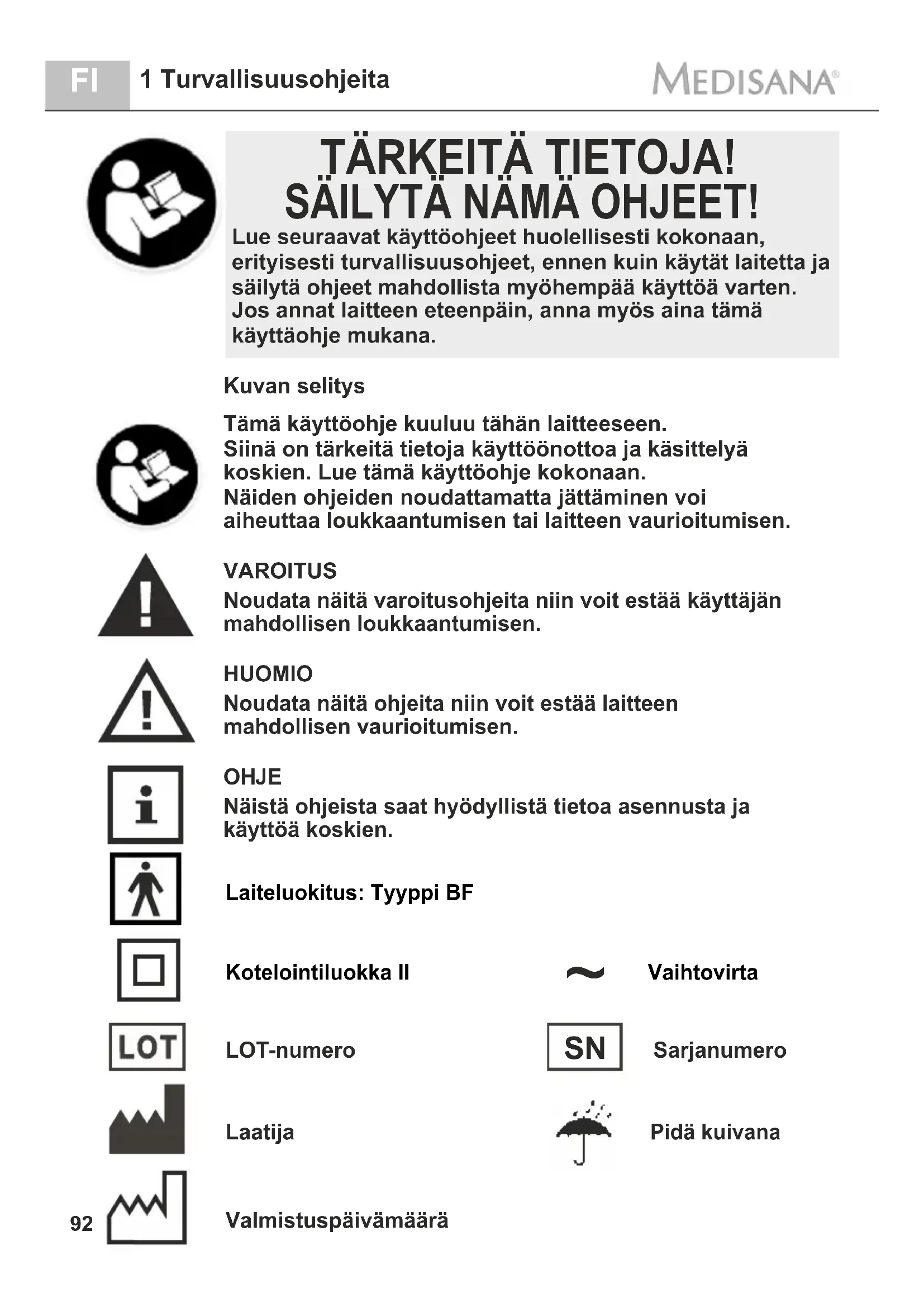91Lue seuraavat käyttöohjeet huolellisesti kokonaan, erityisesti turvallisuusohjeet, ennen kuin käytät laitetta ja säilytä ohjeet mahdollista myöhempää käyttöä varten. Jos annat laitteen eteenpäin, anna myös aina tämä käyttäohje mukana. TÄRKEITÄ TIETOJA! SÄILYTÄ NÄMÄ OHJEET! LOT-numero Sarjanumero Laatija ValmistuspäivämääräLaiteluokitus: Tyyppi BFKotelointiluokka II Vaihtovirta1 Turvallisuusohjeita