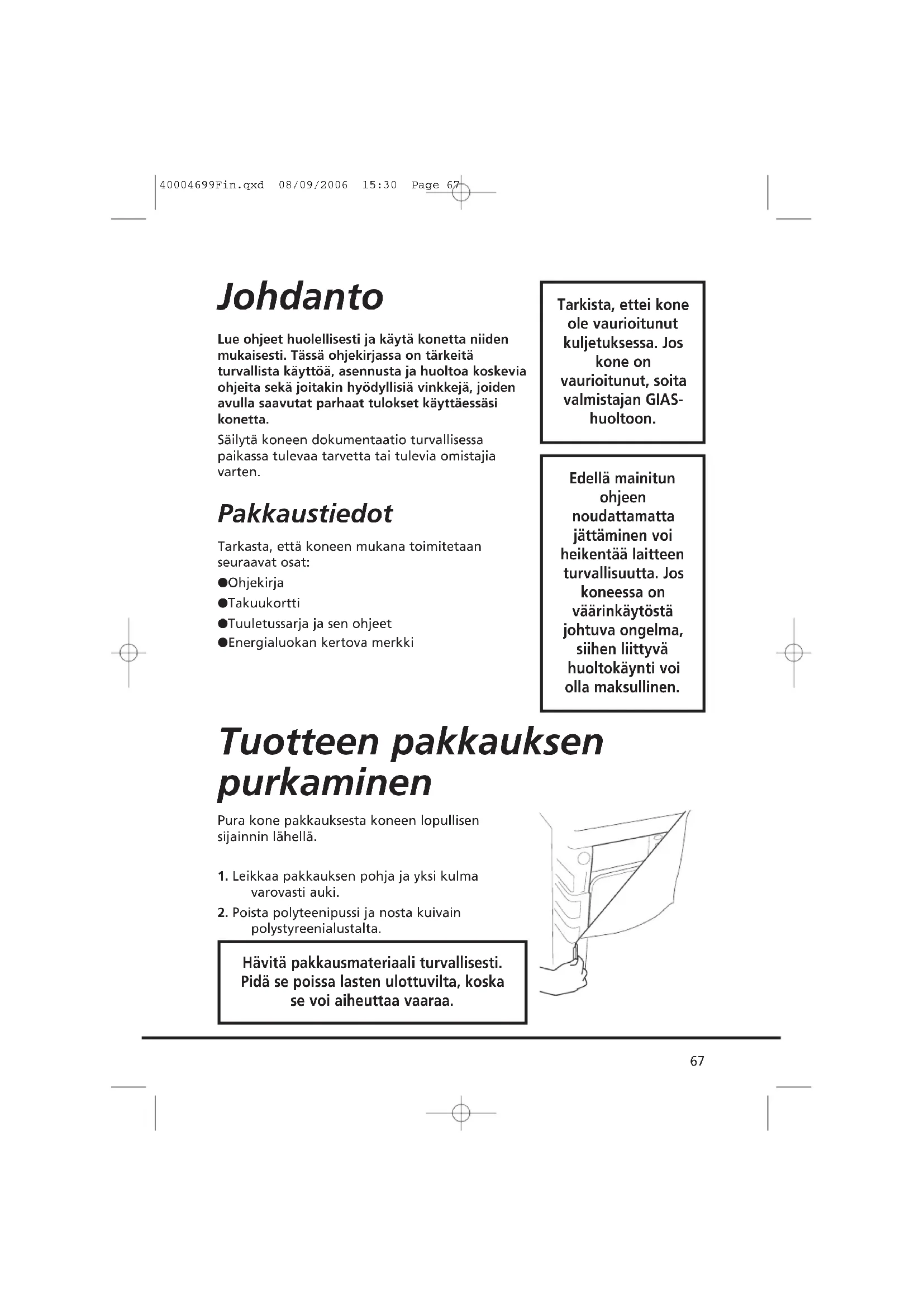 40004699Fin.qxd 08/09/2006 15:30 Page 66Johdanto Lue ohjeet huolellisesti ja käytä konetta niiden mukaisesti. Tässä ohjekirjassa on tärkeitä turvallista käyttöä, asennusta ja huoltoa koskevia ohjeita sekä joitakin hyödyllisiä vinkkejä, joiden avulla saavutat parhaat tulokset käyttäessäsi konetta. Säilytä koneen dokumentaatio turvallisessa paikassa tulevaa tarvetta tai tulevia omistajia varten. Pakkaustiedot Tarkasta, että koneen mukana toimitetaan seuraavat osat: ● Ohjekirja ● Takuukortti ● Tuuletussarja ja sen ohjeet ● Energialuokan kertova merkki Pura kone pakkauksesta koneen lopullisen sijainnin lähellä.