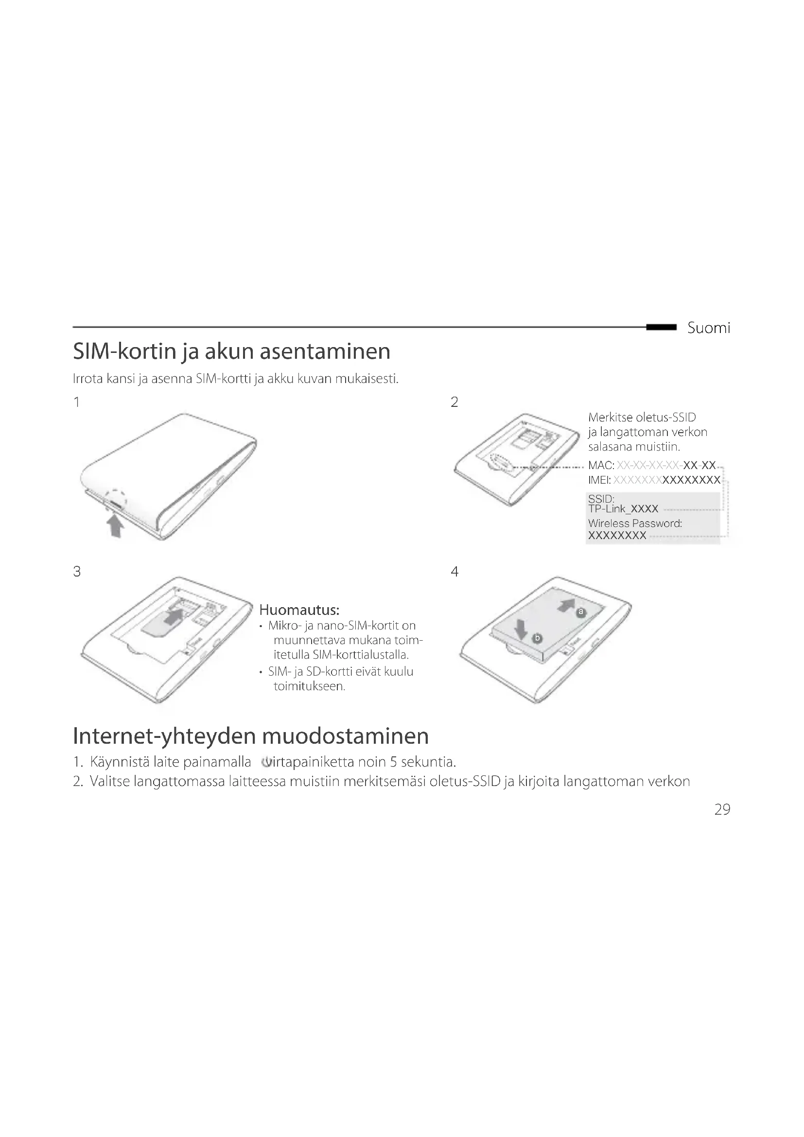 SSID: Wireless Password: TP-Link_XXXX MAC: XX-XX-XX-XX-XX-XX XXXXXXXX IMEI: XXXXXXXXXXXXXXX Merkitse oletus-SSID ja langattoman verkon salasana muistiin.30 Suomi salasana. Huomautus: Suosittelemme, että vaihdat langattoman verkon oletusnimen ja -salasanan turvallisuussyistä. Hyviä hetkiä tuotteesi parissa! Huomautus: