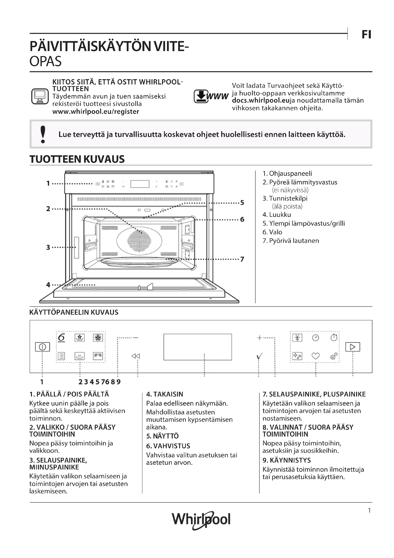 OPAS KIITOS SIITÄ, ETTÄ OSTIT WHIRLPOOLTUOTTEENTäydemmän avun ja tuen saamiseksi rekisteröi tuotteesi sivustolla www . whirlpool . eu/ register WWW Voit ladata Turvaohjeet sekä Käyttö- ja huolto-oppaan verkkosivultamme docs . whirlpool . eu ja noudattamalla tämän vihkosen takakannen ohjeita. Lue terveyttä ja turvallisuutta koskevat ohjeet huolellisesti ennen laitteen käyttöä. TUOTTEEN KUVAUS 1. Ohjauspaneeli2. Pyöreä lämmitysvastus(ei näkyvissä)3. Tunnistekilpi(älä poista)4. Luukku5. Ylempi lämpövastus/grilli6. Valo7. Pyörivä lautanenKÄYTTÖPANEELIN KUVAUS 2 3 4 5 76 8 91. PÄÄLLÄ / POIS PÄÄLTÄKytkee uunin päälle ja poispäältä sekä keskeyttää aktiivisentoiminnon.2. VALIKKO / SUORA PÄÄSYTOIMINTOIHINNopea pääsy toimintoihin ja valikkoon. 3. SELAUSPAINIKE,MIINUSPAINIKEKäytetään valikon selaamiseen ja toimintojen arvojen tai asetusten laskemiseen.4. TAKAISINPalaa edelliseen näkymään.Mahdollistaa asetustenmuuttamisen kypsentämisenaikana.5. NÄYTTÖ6. VAHVISTUSVahvistaa valitun asetuksen taiasetetun arvon.7. SELAUSPAINIKE, PLUSPAINIKEKäytetään valikon selaamiseen jatoimintojen arvojen tai asetustennostamiseen.8. VALINNAT / SUORA PÄÄSYTOIMINTOIHINNopea pääsy toimintoihin, asetuksiin ja suosikkeihin.9. KÄYNNISTYSKäynnistää toiminnon ilmoitettujatai perusasetuksia käyttäen.