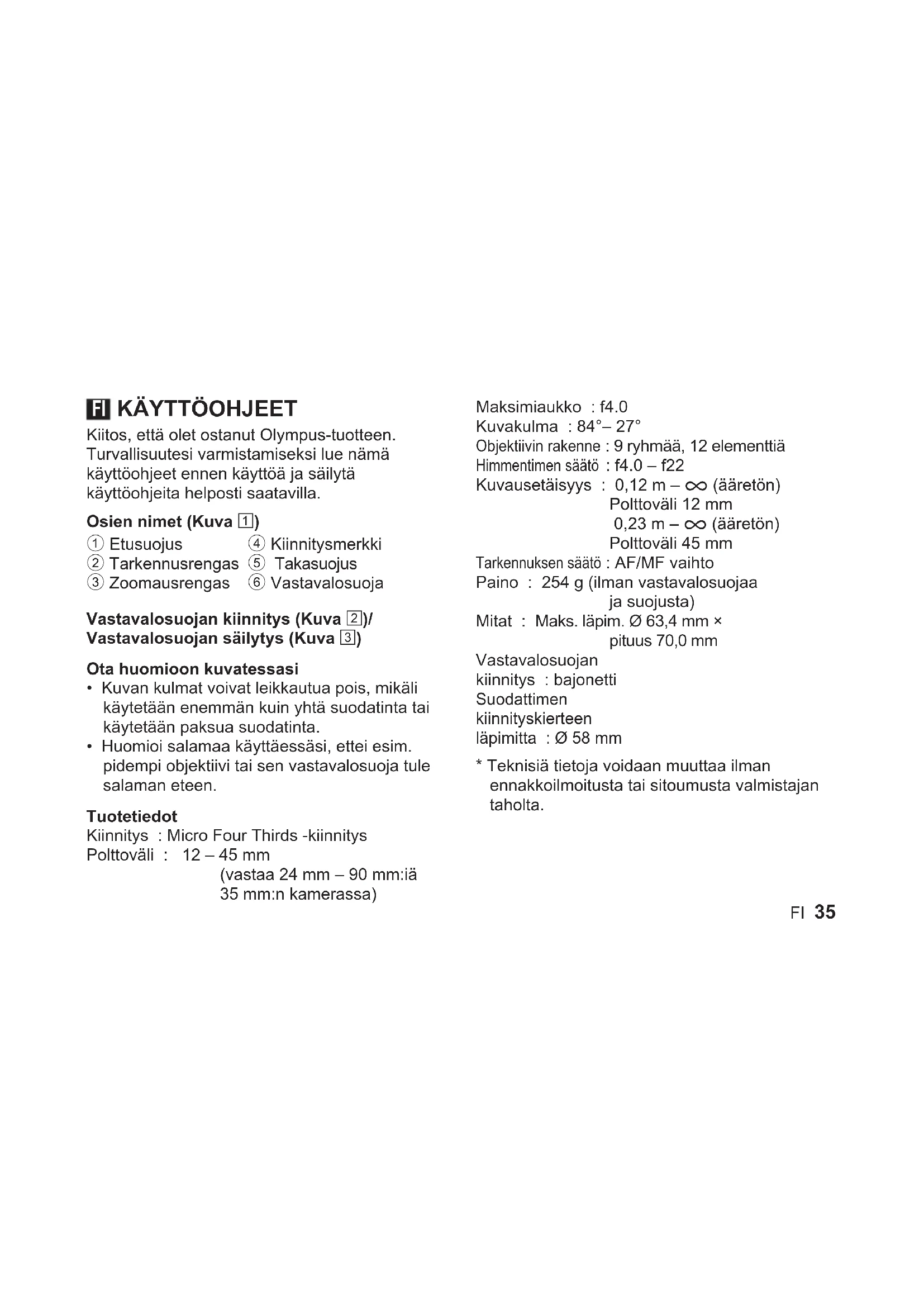 - Huomioi salamaa käyttäessäsi, ettei esim. pidempi objektiivi tai sen vastavalosuoja tule salaman eteen. Tuotetiedot Kiinnitys : Micro Four Thirds -kiinnitys Polttoväli : 12 – 45 mm (vastaa 24 mm – 90 mm:iä 35 mm:n kamerassa) Maksimiaukko : f4.0 Kuvakulma : 84°– 27° Objektiivin rakenne : 9 ryhmää, 12 elementtiä Himmentimen säätö : f4.0 – f22 Kuvausetäisyys : 0,12 m – ) (ääretön) Polttoväli 12 mm 0,23 m – ) (ääretön) Polttoväli 45 mm Tarkennuksen säätö : AF/MF vaihto Paino : 254 g (ilman vastavalosuojaa ja suojusta) Mitat : Maks. läpim. Ø 63,4 mm × pituus 70,0 mm Vastavalosuojan kiinnitys : bajonetti Suodattimen kiinnityskierteen läpimitta : Ø 58 mm