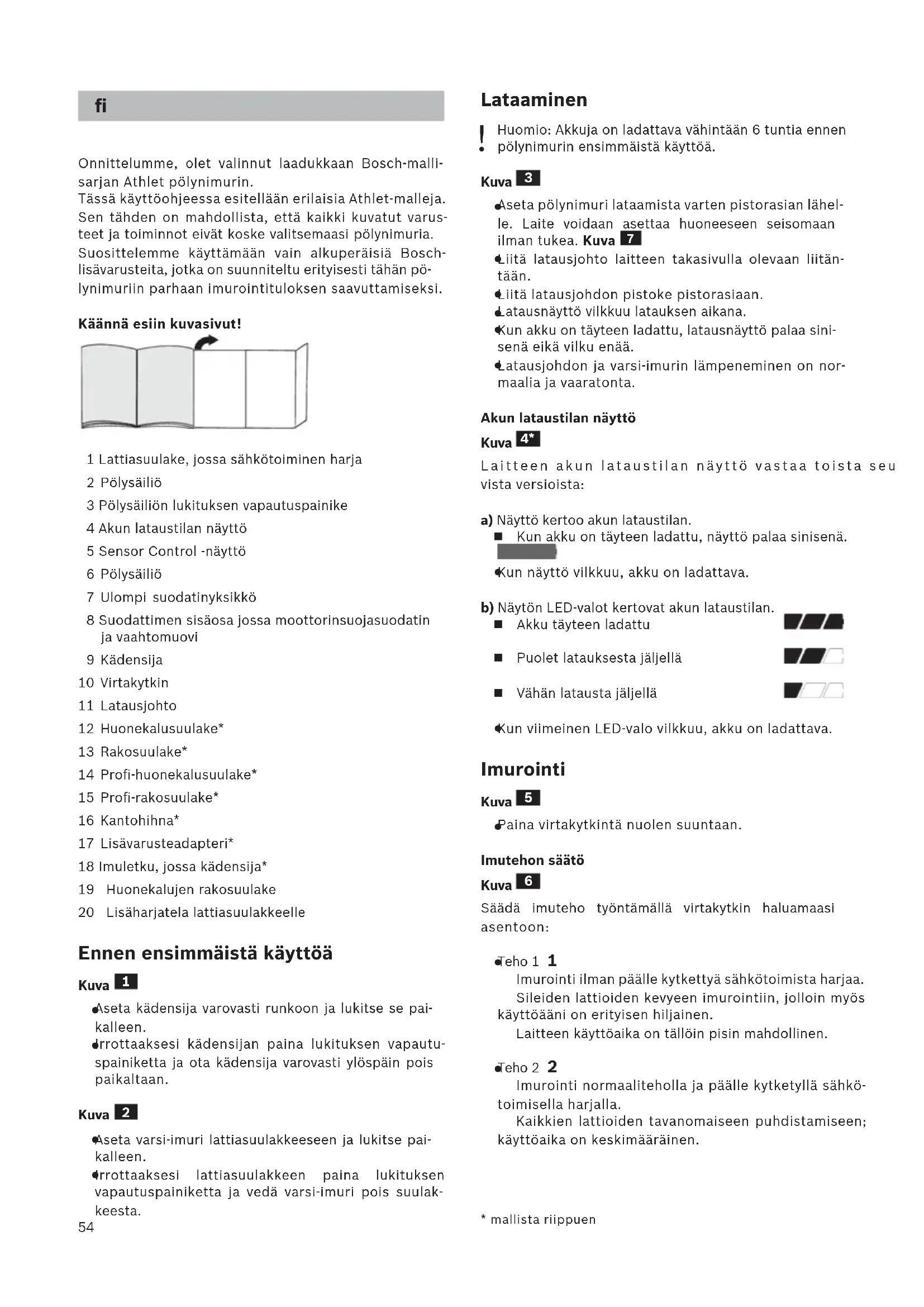 Onnittelumme, olet valinnut laadukkaan Bosch-malli- sarjan Athlet pölynimurin. Tässä käyttöohjeessa esitellään erilaisia Athlet-malleja. Sen tähden on mahdollista, että kaikki kuvatut varus- teet ja toiminnot eivät koske valitsemaasi pölynimuria. Suosittelemme käyttämään vain alkuperäisiä Bosch- lisävarusteita, jotka on suunniteltu erityisesti tähän pö- lynimuriin parhaan imurointituloksen saavuttamiseksi. Käännä esiin kuvasivut! 1 Lattiasuulake, jossa sähkötoiminen harja 2 Pölysäiliö 3 Pölysäiliön lukituksen vapautuspainike 4 Akun lataustilan näyttö 5 Sensor Control -näyttö 6 Pölysäiliö 7 Ulompi suodatinyksikkö 8 Suodattimen sisäosa jossa moottorinsuojasuodatin ja vaahtomuovi 9 Kädensija 10 Virtakytkin 11 Latausjohto 12 Huonekalusuulake* 13 Rakosuulake* 14 Profi-huonekalusuulake* 15 Profi-rakosuulake* 16 Kantohihna* 17 Lisävarusteadapteri* 18 Imuletku, jossa kädensija* 19 Huonekalujen rakosuulake 20 Lisäharjatela lattiasuulakkeelle Ennen ensimmäistä käyttöä Kuva