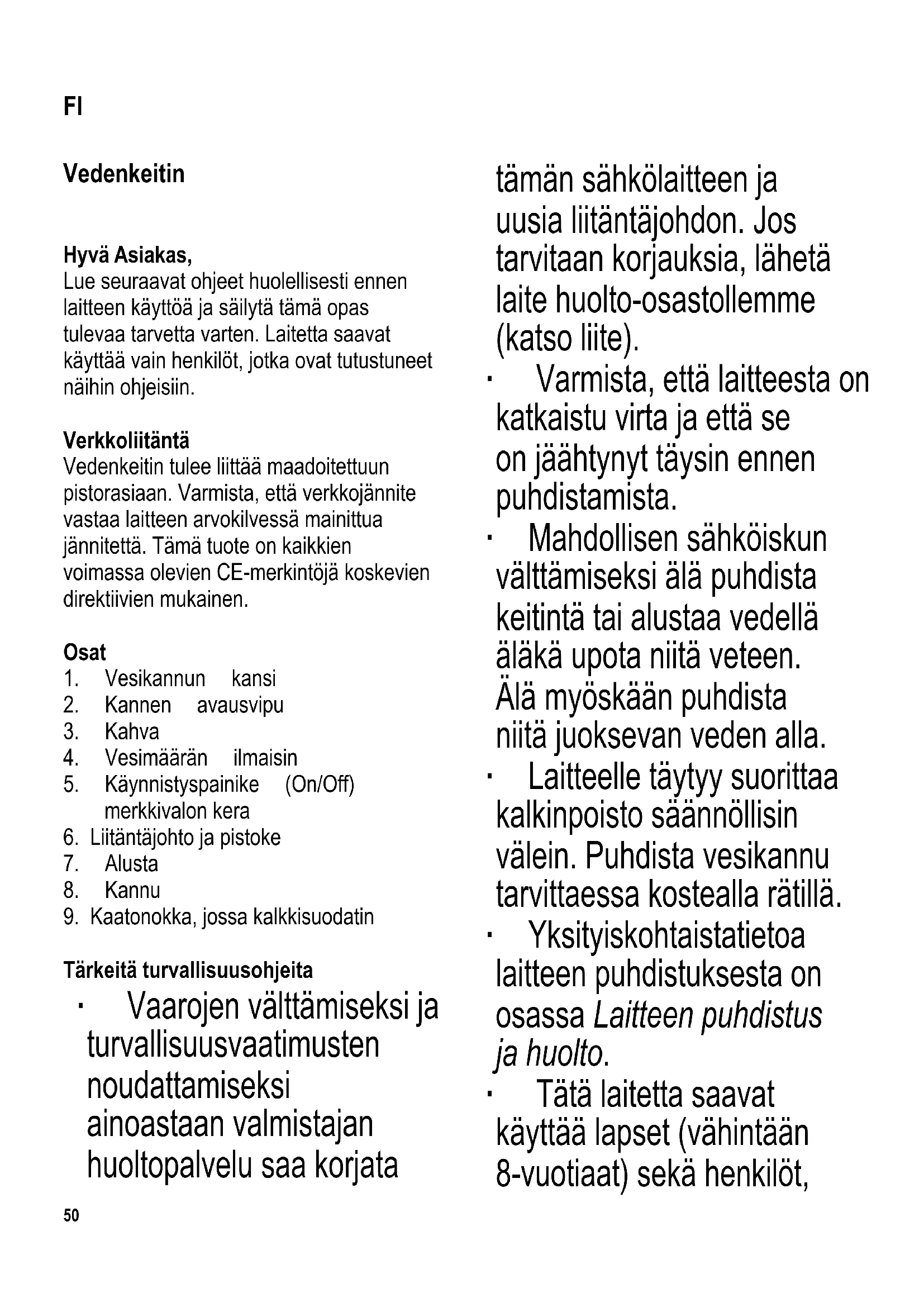 Tärkeitä turvallisuusohjeita ∙ Vaarojen välttämiseksi ja turvallisuusvaatimusten noudattamiseksi ainoastaan valmistajan huoltopalvelu saa korjata tämän sähkölaitteen ja uusia liitäntäjohdon. Jos tarvitaan korjauksia, lähetä laite huolto-osastollemme (katso liite). ∙ Varmista, että laitteesta on katkaistu virta ja että se on jäähtynyt täysin ennen puhdistamista. ∙ Mahdollisen sähköiskun välttämiseksi älä puhdista keitintä tai alustaa vedellä äläkä upota niitä veteen. Älä myöskään puhdista niitä juoksevan veden alla. ∙ Laitteelle täytyy suorittaa kalkinpoisto säännöllisin välein. Puhdista vesikannu tarvittaessa kostealla rätillä. ∙ Yksityiskohtaista tietoa laitteen puhdistuksesta on osassa Laitteen puhdistus ja huolto. ∙ Tätä laitetta saavat käyttää lapset (vähintään 8-vuotiaat) sekä henkilöt, FI51 joilla on fyysisesti, aistillisesti tai henkisesti rajoittunut toimintakyky tai joilla on puuttuvat tai vajavaiset tiedot laitteen toiminnasta, mikäli heitä valvotaan tai ohjataan laitteen käytössä ja he ymmärtävät täysin kaikki käyttöön liittyvät vaarat ja turvatoimenpiteet. ∙ Lasten ei saa antaa leikkiä laitteella. ∙ Lasten ei saa antaa tehdä laitteen puhdistus- tai huoltotoimenpiteitä, elleivät he ole aikuisen valvonnassa sekä vähintään 8 vuotta vanhoja. ∙ Laite ja sen liitäntäjohto täytyy aina pitää alle 8-vuotiaiden ulottumattomissa. ∙ Tämä laite on tarkoitettu kotitalouskäyttöön tai vastaavaan, kuten - ruokalat, toimistot ja muut kaupalliset ympäristöt - maatalousyritykset - hotellien, motellien jne. ja vastaavien yritysten asiakkaat - aamiaisen ja majoituksen tarjoavat majatalot. ∙ Ulkopinnat kuumenevat käytön aikana ja ne pysyvät kuumina jonkin aikaa käytön jälkeen. ∙ Älä jätä vedenkeitintä ilman valvontaa sen ollessa toiminnassa. Käytä vain puhdasta vettä säiliön täyttöön halutulle tasolle ja huomioi minimi- (Min.) (0,5 l) ja maksimitäytön (Max.) (1,7 l) merkit. Kannun täyttämimen liialla vedellä saattaa aiheuttaa kiehuvan veden valumisen ulos. ∙ Varo myös laitteesta tulevaa kuumaa höyryä.52 Älä kosketa laitetta käytön aikana kahvaa lukuunottamatta. ∙ Huomaa: Keittämisen aikana ja kuumaa vettä kaadettaessa kansi on aina pidettävä suljettuna. ∙ Keitintä saa käyttää ainoastaan mukana toimitetun alustan kanssa. ∙ Älä ota vesikannua koskaan pois alustalta (tai laita sitä takaisin alustalle) virran ollessa kytkettynä laitteeseen. ∙ Ellei vesikannu ole alustallaan, varmista, ettei se voi luiskahtaa tasaisella pinnalla. ∙ Alustassa olevat sähköliitännät täytyy aina suojata niin, etteivät niihin pääse vettä. ∙ Varoitus: Väärinkäytöstä saattaa seurata vakavia henkilövammoja. ∙ Varoitus: Pidä lapset poissa pakkausmateriaalien luota potentiaalisen vaaratilanteen esim. tukehtumisvaaran vuoksi. ∙ Tarkasta aina ennen laitteen käyttöä huolellisesti laitteen runko, liitäntäjohto ja mahdolliset asennetut lisäosat vaurioiden varalta. Jos laite on esimerkiksi pudonnut kovalle pinnalle tai liitäntäjohdon vetämiseen on käytetty liikaa voimaa, laitetta ei saa enää käyttää: näkymättömätkin vauriot voivat aiheuttaa laitetta käytettäessä vaaratilanteita. ∙ Laitetta saa käyttää vain tasaisella, kuumuutta kestävällä pinnalla. ∙ Älä käytä laitetta seinään kiinnitetyn kaapin tai vastaavan esineen alla: on olemassa vaara, että poistuva höyry jämähtää sen alapuolelle. ∙ Varo, ettei liitäntäjohto tai kannu kosketa avoliekkiä tai kuumia pintoja (esim. lieden keittolevyjä). ∙ Älä jätä liitäntäjohtoa roikkumaan äläkä anna sen koskettaa kannun kuumia osia. ∙ Noudata erityistä varovaisuutta kantaessasi kannua, kun se sisältää kuumaa vettä. ∙ Irrota pistotulppa pistorasiasta aina - käytön jälkeen - jos laitteessa on käyttöhäiriö - ennen laitteen puhdistamista53 Asianmukainen käyttö ∙ Tämä laite on tarkoitettu ainoastaan puhtaan, raikkaan veden lämmitykseen. Kaikki muu käyttö on määräystenvastaista ja voi aiheuttaa henkilövammoja tai aineellisia vahinkoja. ∙ Se ei sovellu maidon, teen tai muiden ruokien tai juomien lämmitykseen. Automaattinen virrankatkaisu Esiasetettu automaattinen turvakytkin suojaa lämpövastusta ylikuumenemiselta, jos laitteeseen kytketään vahingossa virta sen ollessa ilman vettä tai jos kuumalevyyn on kerääntynyt kalkkia. Kun turvakytkin on katkaissut keittimestä virran, laitteen on annettava jäähtyä riittävästi tai siitä on poistettava kalkkisaostuma ennen verkkoon kytkemistä. Ennen käyttöä Täydellisen puhtauden varmistamiseksi kaada pois ensimmäinen kannullinen keitettyä vettä. Veden keittäminen ∙ Ota kannu pois alustalta. ∙ Paina kannen avausvipua kahvasta, avaa kansi ja lisää kannuun haluamasi määrä vettä. Huomioi tuolloin minimi- (Min) (0,5 l) ja maksimitäytön merkit (Max) (1,7 l). ∙ Sulje kansi ja sijoita vesikannu takaisin sen alustalle. ∙ Työnnä pistotulppa sopivaan pistorasiaan ja paina käynnistyspainiketta (On/Off). Merkkivalo syttyy. ∙ Vedenkeitto alkaa. Kun vesi saavuttaa kiehumispisteen, sisäänrakennettu kytkin katkaisee keittimestä virran automaattisesti. Merkkivalo sammuu. ∙ Jos haluat keskeyttää vedenkeiton, aseta käynnistyskytkin Off-asentoon. ∙ Kun haluat kaataa kuumaa vettä, ota kannu pois alustalta. ∙ Kuuman höyryn ulostulon estämiseksi varmista, että kansi pysyy kiinni vettä kaadettaessa. ∙ Irrota pistotulppa pistorasiasta käytön jälkeen. ∙ Älä jätä yhtään vettä kannuun. Kelattavan liitäntäjohdon säilytystila Alustan pohjassa oleva kelattavan liitäntäjohdon säilytystila helpottaa laitteen varastoimista sekä johdon pituuden säätelyä käytön aikana. Kalkinpoisto ∙ Paikallisen veden laadusta riippuen vastukseen saattaa kertyä kalkkia, joka tulee poistaa säännöllisin väliajoin. ∙ Kaikki takuuvaatimukset mitätöityvät, 