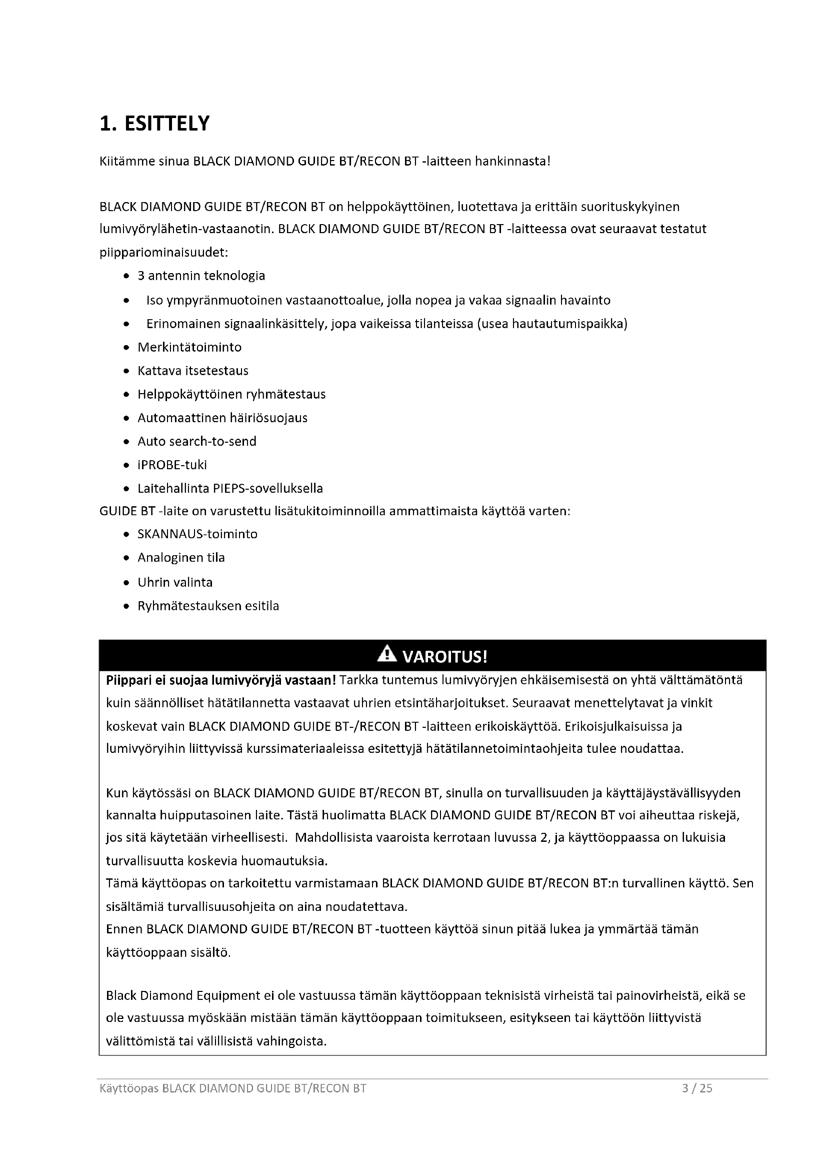 - Ryhmätestauksen esitila VAROITUS! Piippari ei suojaa lumivyöryjä vastaan! Tarkka tuntemus lumivyöryjen ehkäisemisestä on yhtä välttämätöntä kuin säännölliset hätätilannetta vastaavat uhrien etsintäharjoitukset. Seuraavat menettelytavat ja vinkit koskevat vain BLACK DIAMOND GUIDE BT-/RECON BT -laitteen erikoiskäyttöä. Erikoisjulkaisuissa ja lumivyöryihin liittyvissä kurssimateriaaleissa esitettyjä hätätilannetoimintaohjeita tulee noudattaa. Kun käytössäsi on BLACK DIAMOND GUIDE BT/RECON BT, sinulla on turvallisuuden ja käyttäjäystävällisyyden kannalta huipputasoinen laite. Tästä huolimatta BLACK DIAMOND GUIDE BT/RECON BT voi aiheuttaa riskejä, jos sitä käytetään virheellisesti. Mahdollisista vaaroista kerrotaan luvussa 2, ja käyttöoppaassa on lukuisia turvallisuutta koskevia huomautuksia. Tämä käyttöopas on tarkoitettu varmistamaan BLACK DIAMOND GUIDE BT/RECON BT:n turvallinen käyttö. Sen sisältämiä turvallisuusohjeita on aina noudatettava. Ennen BLACK DIAMOND GUIDE BT/RECON BT -tuotteen käyttöä sinun pitää lukea ja ymmärtää tämän käyttöoppaan sisältö. Black Diamond Equipment ei ole vastuussa tämän käyttöoppaan teknisistä virheistä tai painovirheistä, eikä se ole vastuussa myöskään mistään tämän käyttöoppaan toimitukseen, esitykseen tai käyttöön liittyvistä välittömistä tai välillisistä vahingoista.Käyttöopas BLACK DIAMOND GUIDE BT/RECON BT 4 / 25 Tekijänoikeus