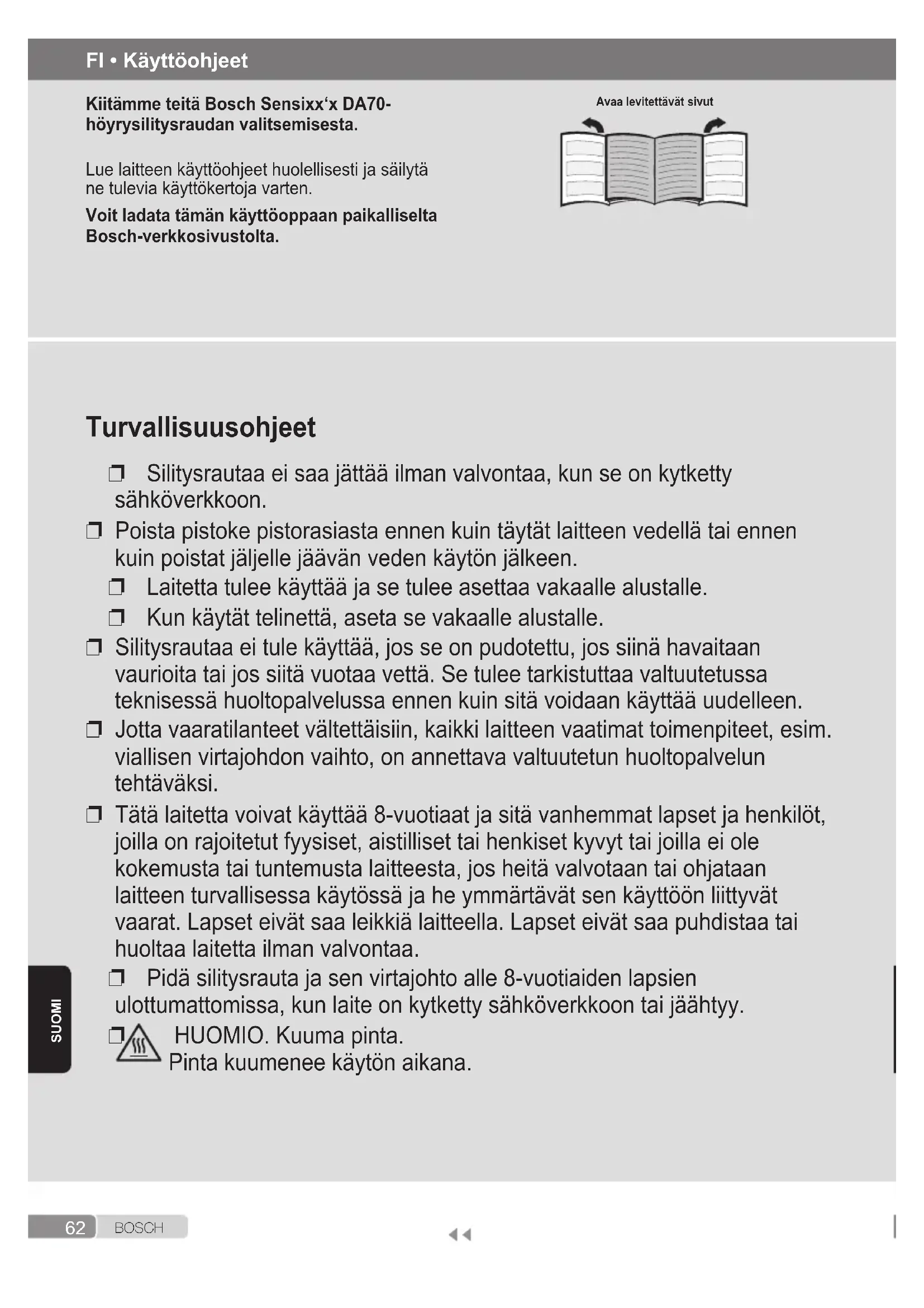 HUOMIO. Kuuma pinta. Pinta kuumenee käytön aikana. FI • Käyttöohjeet Kiitämme teitä Bosch Sensixx‘x DA70- höyrysilitysraudan valitsemisesta. Lue laitteen käyttöohjeet huolellisesti ja säilytä ne tulevia käyttökertoja varten. Voit ladata tämän käyttöoppaan paikalliselta Bosch-verkkosivustolta. Avaa levitettävät sivut63 B O S C H