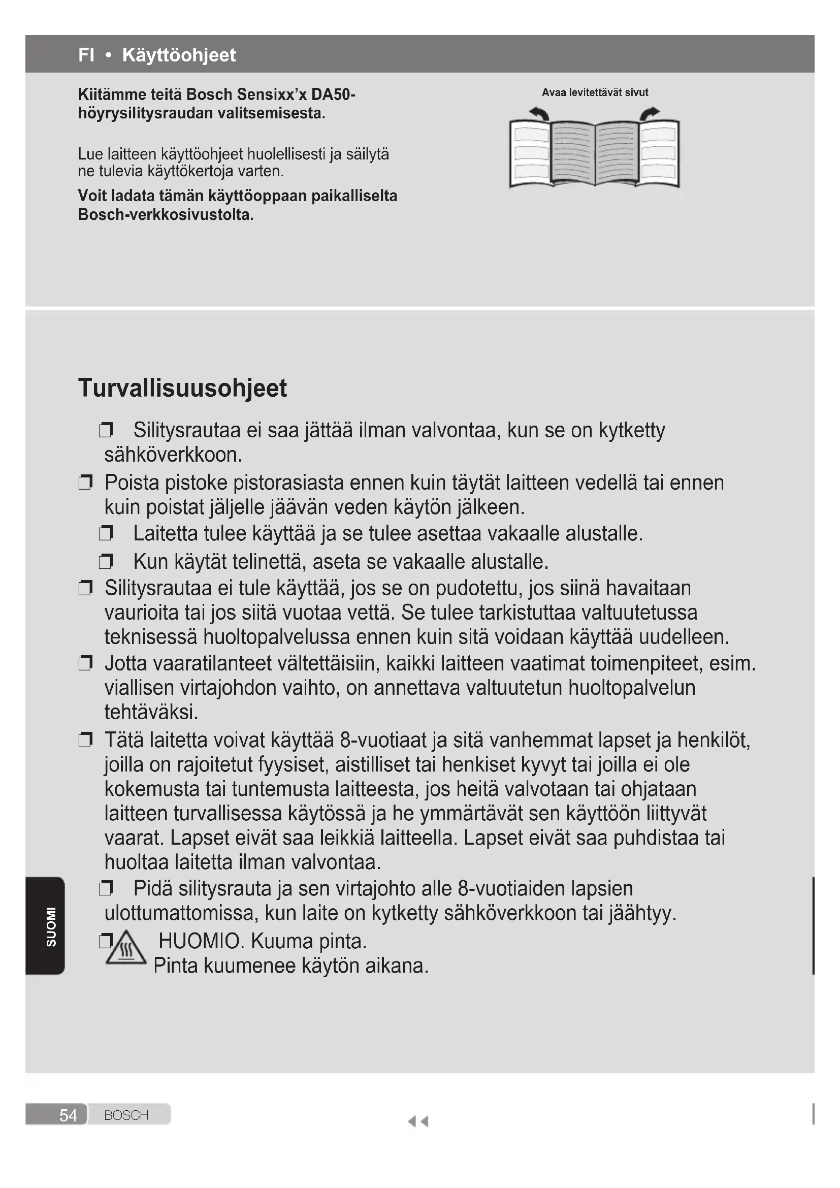 HUOMIO. Kuuma pinta. Pinta kuumenee käytön aikana. FI • Käyttöohjeet Kiitämme teitä Bosch Sensixx’x DA50- höyrysilitysraudan valitsemisesta. Lue laitteen käyttöohjeet huolellisesti ja säilytä ne tulevia käyttökertoja varten. Voit ladata tämän käyttöoppaan paikalliselta Bosch-verkkosivustolta. Avaa levitettävät sivut55 B O S C H