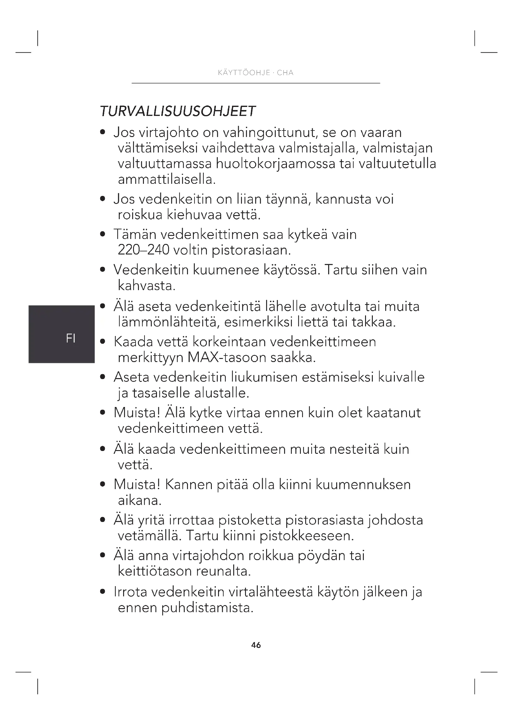 - Tämän vedenkeittimen saa kytkeä vain 220–240voltin pistorasiaan.