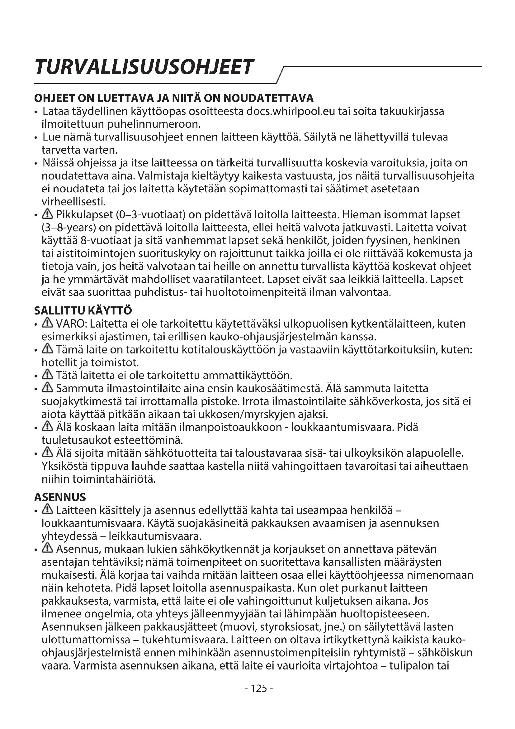 Asennus, mukaan lukien sähkökytkennät ja korjaukset on annettava pätevän asentajan tehtäviksi; nämä toimenpiteet on suoritettava kansallisten määräysten mukaisesti. Älä korjaa tai vaihda mitään laitteen osaa ellei käyttöohjeessa nimenomaan näin kehoteta. Pidä lapset loitolla asennuspaikasta. Kun olet purkanut laitteen pakkauksesta, varmista, että laite ei ole vahingoittunut kuljetuksen aikana. Jos ilmenee ongelmia, ota yhteys jälleenmyyjään tai lähimpään huoltopisteeseen. Asennuksen jälkeen pakkausjätteet (muovi, styroksiosat, jne.) on säilytettävä lasten ulottumattomissa– tukehtumisvaara. Laitteen on oltava irtikytkettynä kaikista kauko- ohjausjärjestelmistä ennen mihinkään asennustoimenpiteisiin ryhtymistä – sähköiskun vaara. Varmista asennuksen aikana, että laite ei vaurioita virtajohtoa – tulipalon tai TURVALLISUUSOHJEET- 126 - sähköiskun vaara. Kytke laite päälle vasta kun asennus on valmis.
