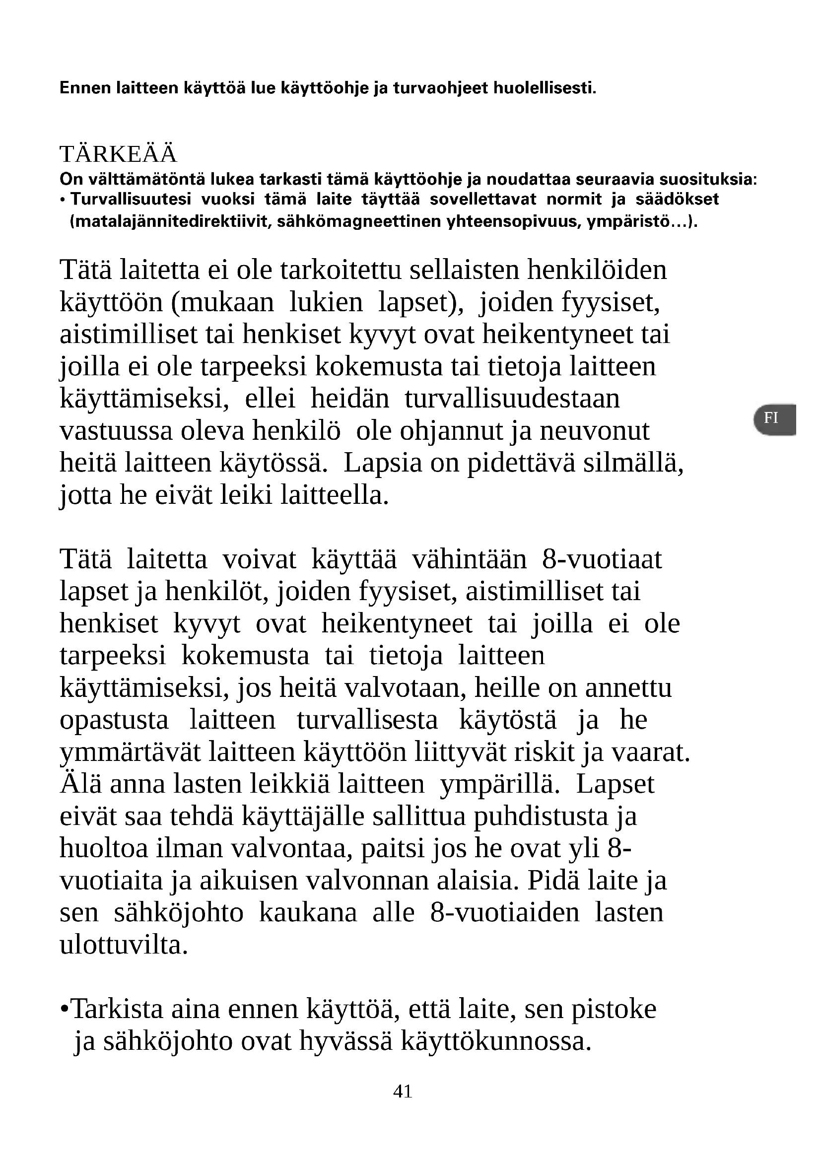 - Tarkista aina ennen käyttöä, että laite, sen pistoke ja sähköjohto ovat hyvässä käyttökunnossa. FI42