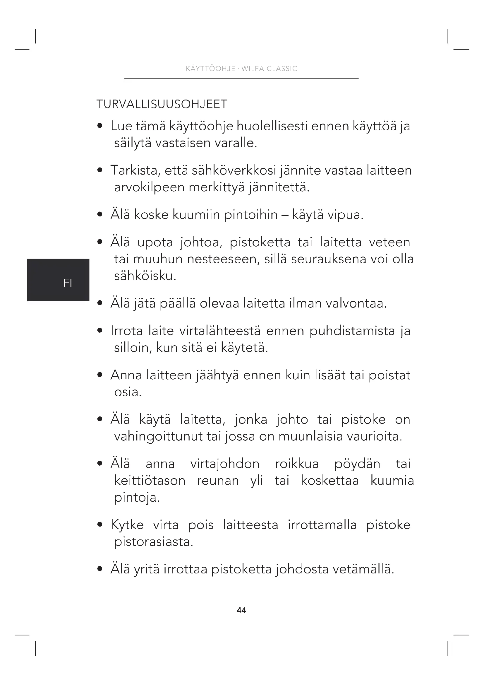 Tukiasioissa käy osoitteessa wilfa. ja tutustu asiakaspalvelu- ja tukisivuumme. Sieltä löydät usein kysytyt kysymykset, varaosat, vinkit ja neuvot sekä kaikki yhteystietomme. KIERRÄTYS Tämä merkki osoittaa, että laitetta ei saa hävittää missään EU:n alueella talousjätteen mukana. Laite tulee kierrättää vastuullisesti ja kestävän kehityksen periaatteiden mukaisesti, jottei ympäristölle ja ihmisten terveydelle aiheudu haittaa. Kierrätä käytetty laite viemällä se keräyspisteeseen tai palauttamalla se tuotteen jälleenmyyjälle. Tällöin se käsitellään ympäristön kannalta turvallisesti.52