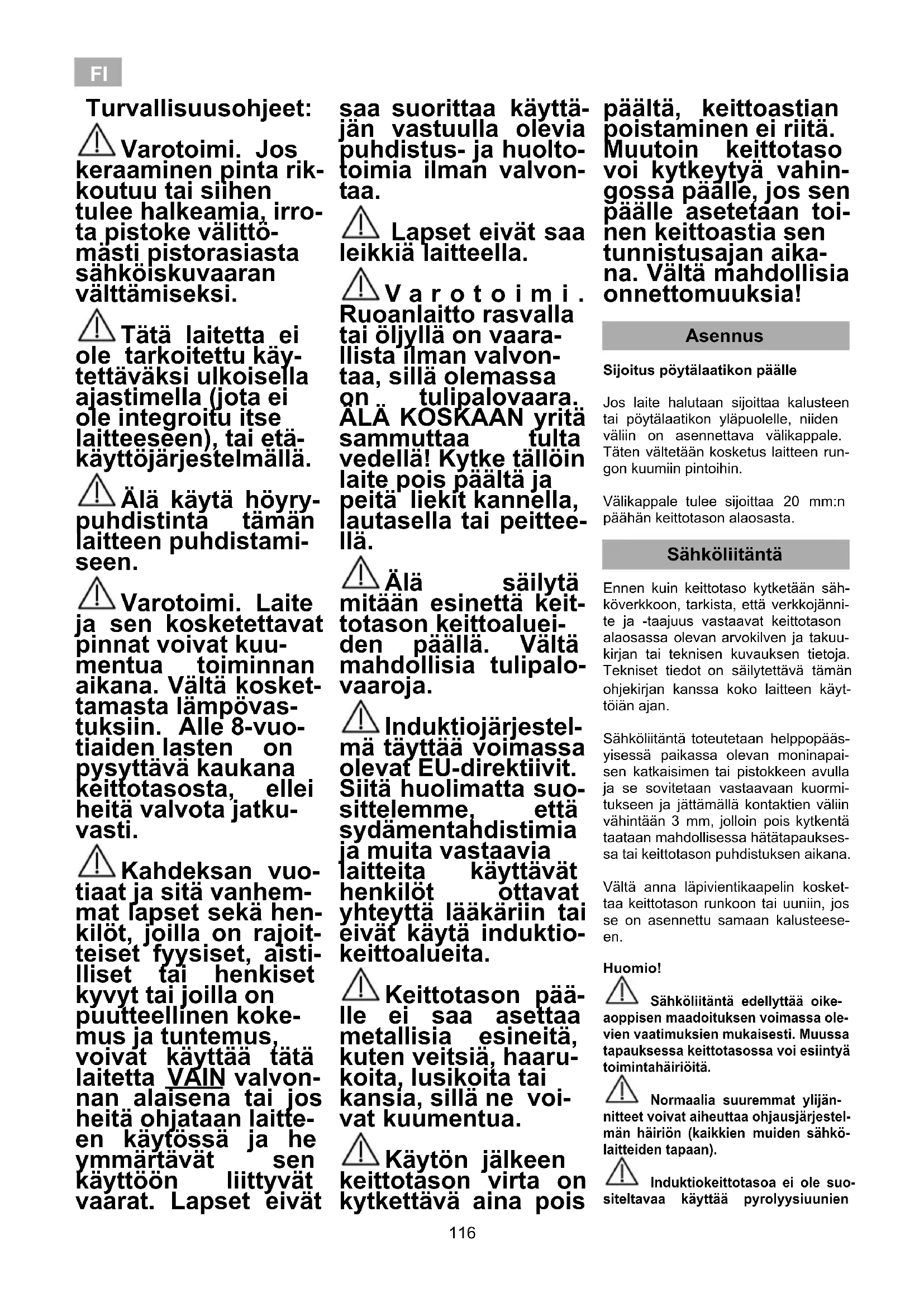 115FI Turvallisuusohjeet: Varotoimi. Jos keraaminen pinta rik- koutuu tai siihen tulee halkeamia, irro- ta pistoke välittö- mästi pistorasiasta sähköiskuvaaran välttämiseksi. Tätä laitetta ei ole tarkoitettu käy- tettäväksi ulkoisella ajastimella (jota ei ole integroitu itse laitteeseen), tai etä- käyttöjärjestelmällä. Älä käytä höyry- puhdistinta tämän laitteen puhdistami- seen. Varotoimi. Laite ja sen kosketettavat pinnat voivat kuu- mentua toiminnan aikana. Vältä kosket- tamasta lämpövas- tuksiin. Alle 8-vuo- tiaiden lasten on pysyttävä kaukana keittotasosta, ellei heitä valvota jatku- vasti. Kahdeksan vuo- tiaat ja sitä vanhem- mat lapset sekä hen- kilöt, joilla on rajoit- teiset fyysiset, aisti- lliset tai henkiset kyvyt tai joilla on puutteellinen koke- mus ja tuntemus, voivat käyttää tätä laitetta VAIN valvon- nan alaisena tai jos heitä ohjataan laitte- en käytössä ja he ymmärtävät sen käyttöön liittyvät vaarat. Lapset eivät saa suorittaa käyttä- jän vastuulla olevia puhdistus- ja huolto- toimia ilman valvon- taa. Lapset eivät saa leikkiä laitteella. V a r o t o i m i . Ruoanlaitto rasvalla tai öljyllä on vaara- llista ilman valvon- taa, sillä olemassa on tulipalovaara. ÄLÄ KOSKAAN yritä sammuttaa tulta vedellä! Kytke tällöin laite pois päältä ja peitä liekit kannella, lautasella tai peittee- llä. Älä säilytä mitään esinettä keit- totason keittoaluei- den päällä. Vältä mahdollisia tulipalo- vaaroja. Induktiojärjestel- mä täyttää voimassa olevat EU-direktiivit. Siitä huolimatta suo- sittelemme, että sydämentahdistimia ja muita vastaavia laitteita käyttävät henkilöt ottavat yhteyttä lääkäriin tai eivät käytä induktio- keittoalueita. Keittotason pää- lle ei saa asettaa metallisia esineitä, kuten veitsiä, haaru- koita, lusikoita tai kansia, sillä ne voi- vat kuumentua. Käytön jälkeen keittotason virta on kytkettävä aina pois päältä, keittoastian poistaminen ei riitä. Muutoin keittotaso voi kytkeytyä vahin- gossa päälle, jos sen päälle asetetaan toi- nen keittoastia sen tunnistusajan aika- na. Vältä mahdollisia onnettomuuksia! Asennus Sijoitus pöytälaatikon päälle Jos laite halutaan sijoittaa kalusteen tai pöytälaatikon yläpuolelle, niiden väliin on asennettava välikappale. Täten vältetään kosketus laitteen run- gon kuumiin pintoihin. Välikappale tulee sijoittaa 20 mm:n päähän keittotason alaosasta. Sähköliitäntä Ennen kuin keittotaso kytketään säh- köverkkoon, tarkista, että verkkojänni- te ja -taajuus vastaavat keittotason alaosassa olevan arvokilven ja takuu- kirjan tai teknisen kuvauksen tietoja. Tekniset tiedot on säilytettävä tämän ohjekirjan kanssa koko laitteen käyt- töiän ajan. Sähköliitäntä toteutetaan helppopääs- yisessä paikassa olevan moninapai- sen katkaisimen tai pistokkeen avulla ja se sovitetaan vastaavaan kuormi- tukseen ja jättämällä kontaktien väliin vähintään 3 mm, jolloin pois kytkentä taataan mahdollisessa hätätapaukses- sa tai keittotason puhdistuksen aikana. Vältä anna läpivientikaapelin kosket- taa keittotason runkoon tai uuniin, jos se on asennettu samaan kalusteese- en. Huomio! Sähköliitäntä edellyttää oike- aoppisen maadoituksen voimassa ole- vien vaatimuksien mukaisesti. Muussa tapauksessa keittotasossa voi esiintyä toimintahäiriöitä. Normaalia suuremmat ylijän- nitteet voivat aiheuttaa ohjausjärjestel- män häiriön (kaikkien muiden sähkö- laitteiden tapaan). Induktiokeittotasoa ei ole suo- siteltavaa käyttää pyrolyysiuunien 116FI pyrolyysipuhdistuksen aikana, sillä lai- te kuumenee tällöin erittäin korkeisiin lämpötiloihin. Laitteen käsittelu ja korjaus, mukaan lukien virtajohdon vaihto, on jätettävä virallisen TEKA-huolto- palvelun vastuulle. Ennen laitteen kytkemistä irti sähköverkosta on suositeltavaa kytkeä pois päältä katkaisin ja odot- taa noin 25 sekuntia ennen pistok- keen irrottamista. Tämän ajan kuluessa sähköpiirin virta poistuu kokonaan ja mahdollinen pistokke- en koskettimien aiheuttama säh- köiskuvaara vältetään. Säilytä takuutodistus tai ohje- kirjan mukana toimitetut tekniset tiedot koko laitteen käyttöiän ajan. Se sisältää tärkeitä teknisiä tietoja. Käyttö ja huolto Kosketuspainikkeiden käyttöohjeet OHJAIMET (kuva 2) Käynnistys-/sammutuspainike. Keittoalueen osoitin. Teho- ja/tai jälkilämmön osoittimet*. Keittoalueen valintapainikkeet. Kellon desimaalipiste*. Kellopainike. Aikanäyttö. Muiden painikkeiden lukituspainike. Teho- ja/tai jälkilämmön osoittimien desimaalispiste*. Aktivoidun lukituksen merkkivalo*. Tehon/ajan vähennyspainike. Tehon/ajan suurennuspainike.