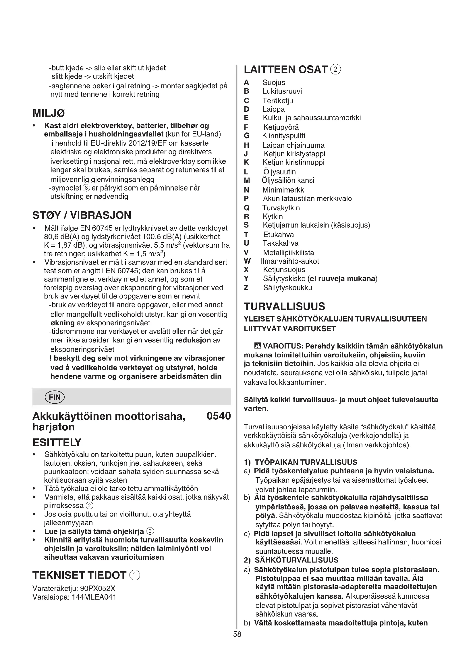 a) Anna koulutettujen ammattihenkilöiden korjata sähkötyökalusi ja hyväksy korjauksiin vain alkuperäisiä varaosia. Täten varmistat, että sähkötyökalu säilyy turvallisena. b) Älä missään tapauksessa yritä itse korjata vaurioituneita akkuja. Akkuja saa korjata vain valmistaja tai valtuutettu huoltopiste. KETJUSAHOJEN VARO-OHJEET