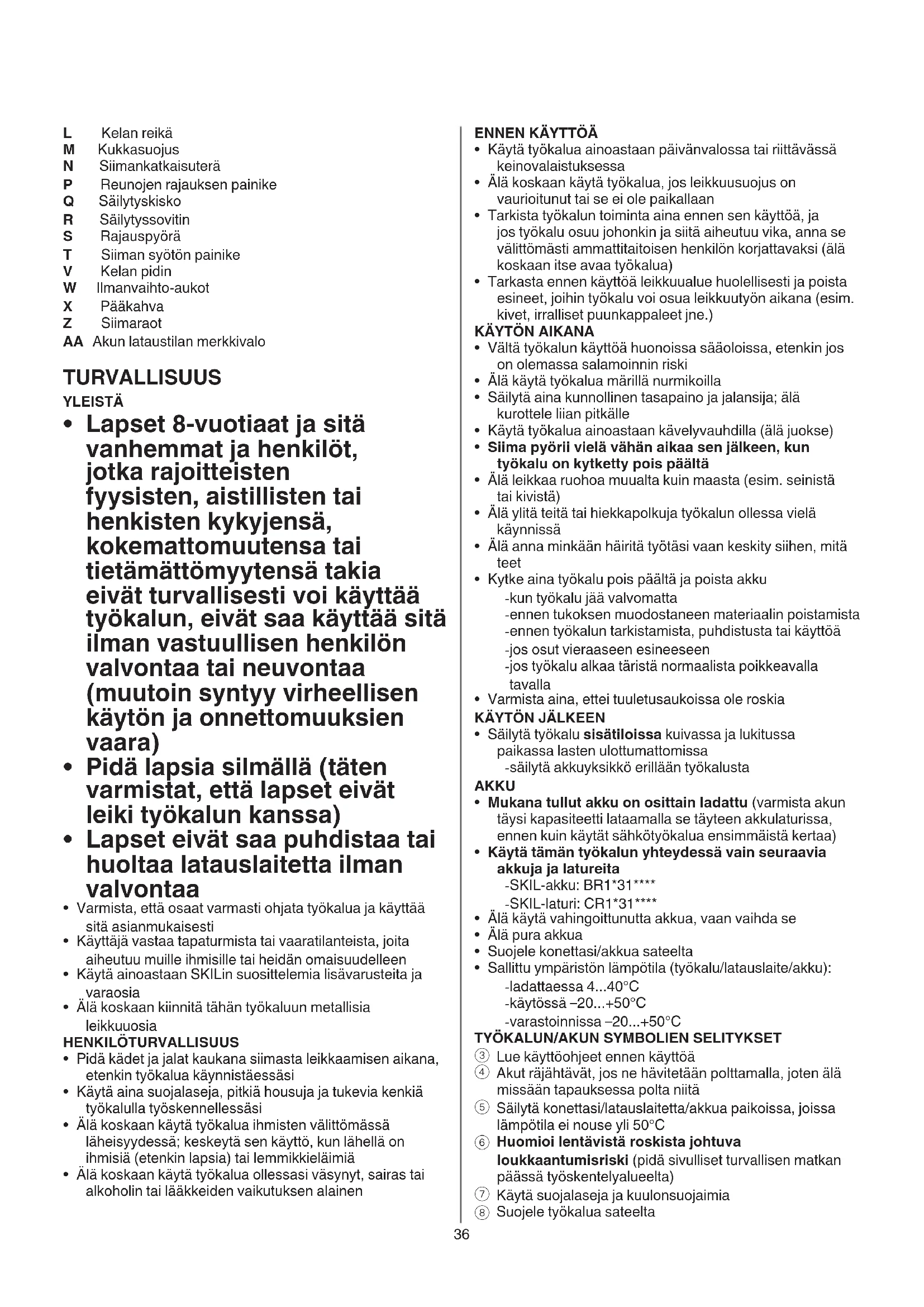 Suojele työkalua sateelta L Kelan reikä M Kukkasuojus N Siimankatkaisuterä P Reunojen rajauksen painike Q Säilytyskisko R Säilytyssovitin S Rajauspyörä T Siiman syötön painike V Kelan pidin W Ilmanvaihto-aukot X Pääkahva Z Siimaraot AA Akun lataustilan merkkivalo TURVALLISUUS YLEISTÄ