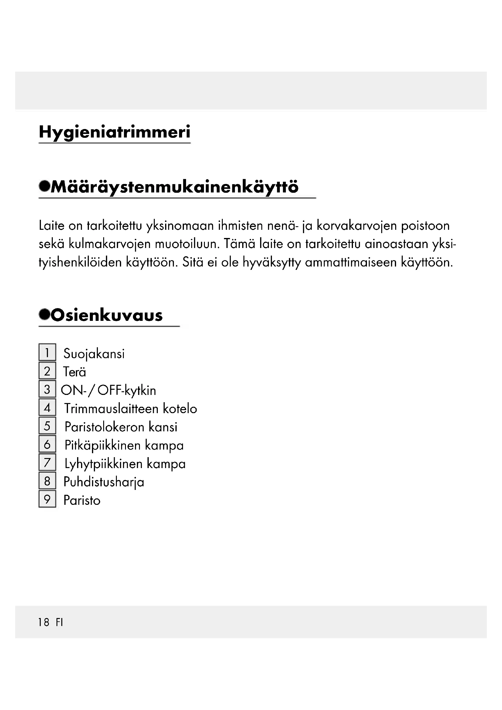 Operation and Safety Notes Translation of original operating instruction HY GIENIATRIMMERI Käyttö- ja turvallisuusohjeet Alkuperäisen käyttöohjeen käännös