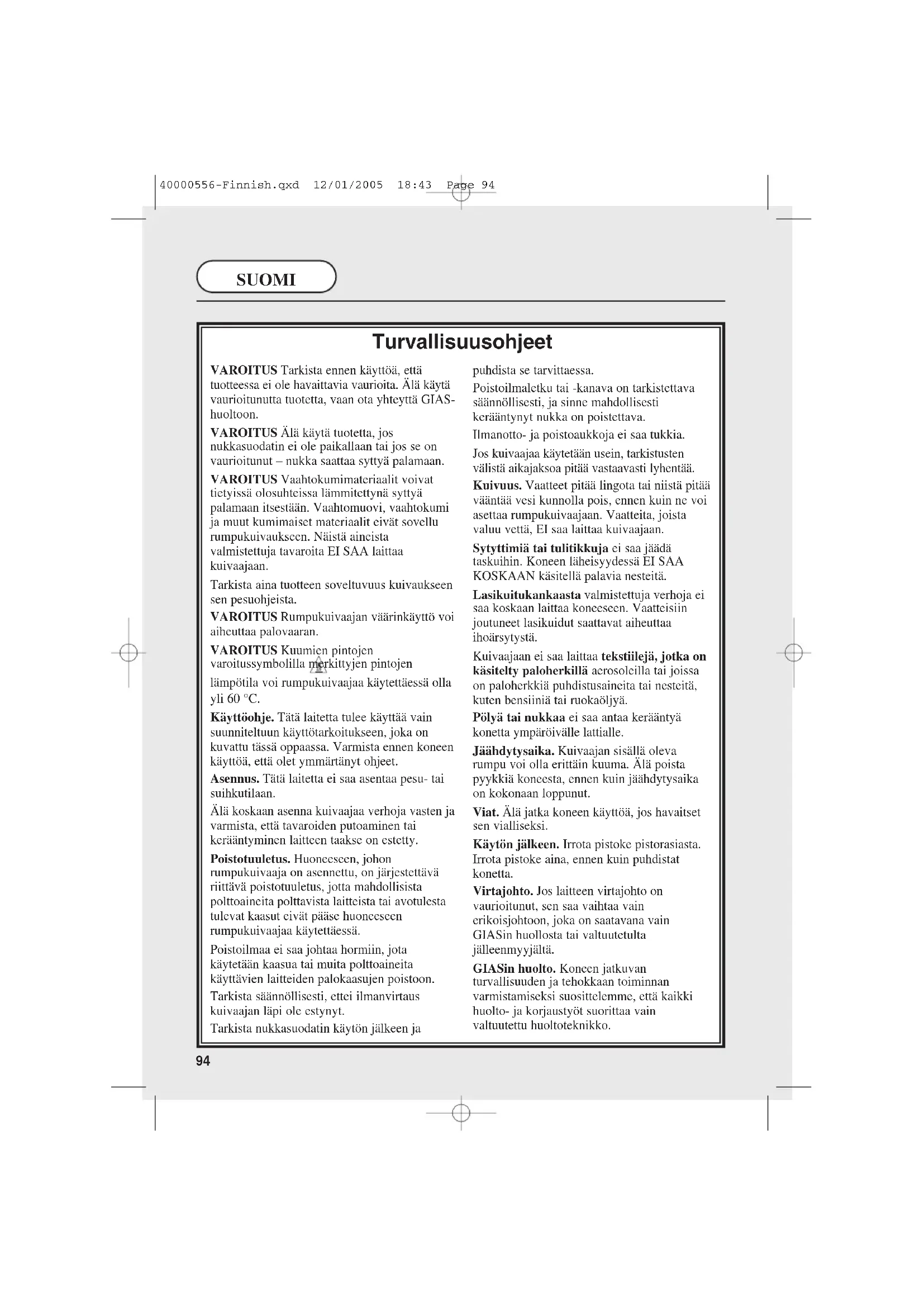 SUOMI LUE NÄMÄ OHJEET LÄPI HUOLELLISESTI Tämän laitteen käytössä tulee noudattaa tässä käyttöohjeessa annettuja ohjeita. Laite on tarkoitettu yksityiseen käyttöön kotitalouksien tekstiilien ja vaatekappaleiden kuivaukseen, kun niiden pesemiseen on käytetty vesiliuotteita. Sitä EI SAA käyttää kuivapesuaineilla pestyjen materiaalien kuivaukseen. Oman turvallisuutesi takia, kuivaaja pitää asentaa oikein. Jos asennuksessa on jotain epäselvää, soita paikalliseen GIAS-huoltoon ja kysy lisäohjeita. VAROITUS!