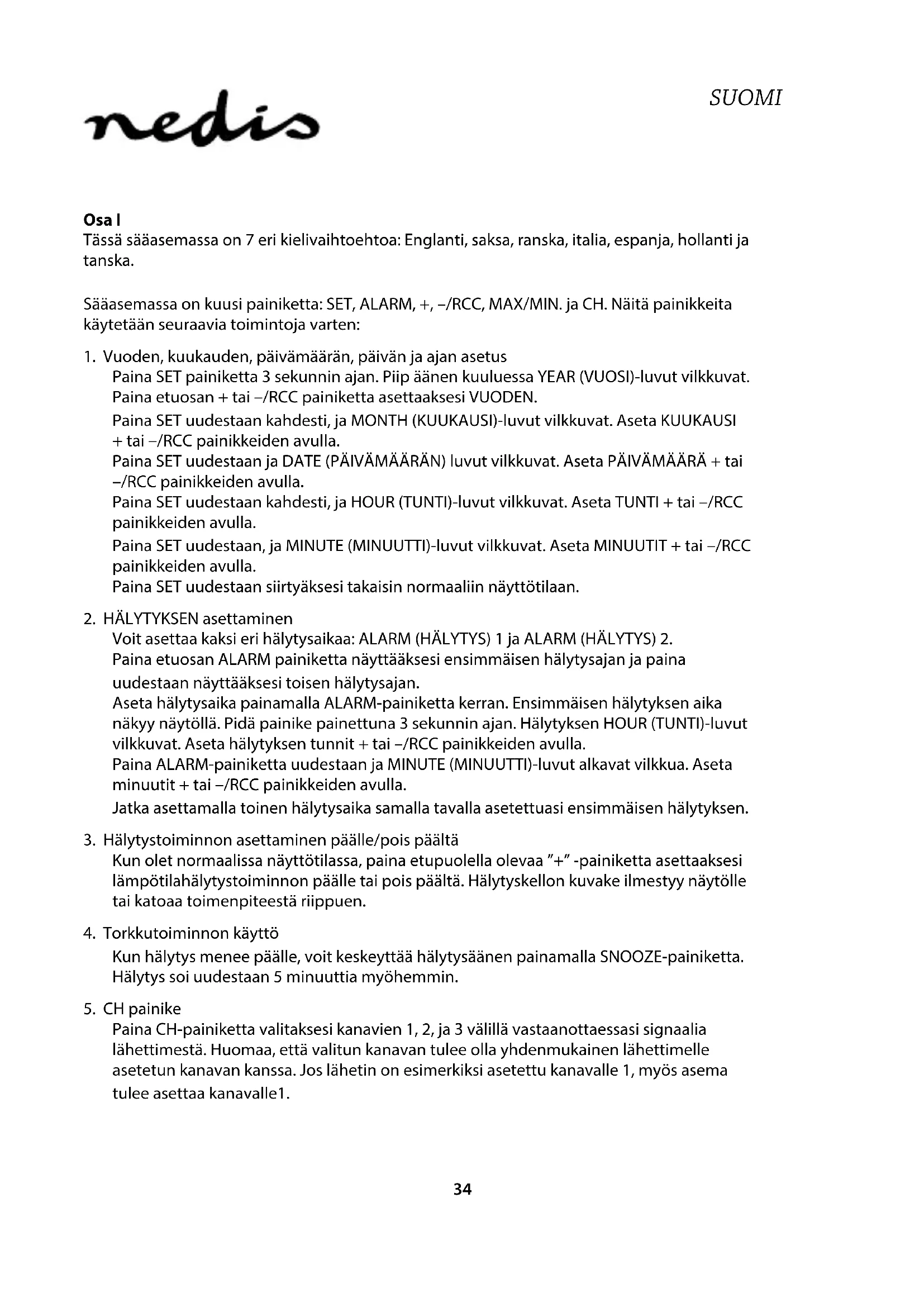 ÄLÄ AVAA Turvallisuustoimenpiteet: Sähköiskun riskin pienentämiseksi, AINOASTAAN valtuutettu huoltohenkilö saa avata tämän laitteen huoltoa varten. Jos ongelmia ilmenee, irrota laite verkkovirrasta ja muista laitteista. Älä altista laitetta vedelle ja kosteudelle. Huolto: Puhdista ainoastaan kuivalla liinalla. Älä käytä liuottimia tai hankausaineita. Takuu: Takuu ja vastuuvelvollisuus mitätöityvät, jos tuote vaurioituu siihen tehtyjen muutoksien tai sen väärinkäytön takia. Yleistä: Muutoksia malliin ja teknisiin ominaisuuksiin voidaan tehdä ilmoituksetta. Kaikki logot, merkit ja tuotenimet ovat niiden vastaavien omistajien tuotemerkkejä tai rekisteröityjä tuotemerkkejä ja niitä on käsiteltävä sellaisina. Säilytä käyttöohjeet ja pakkaus myöhempää käyttötarvetta varten. Huomio: Tämä tuote on merkitty tällä symbolilla. Se merkitsee, ettei käytettyjä sähkö- tai elektronisia tuotteita saa hävittää kotitalousjätteen mukana. Kyseisille tuotteille on olemassa erillinen keräysjärjestelmä. Tämä tuote on valmistettu ja toimitettu noudattaen kaikkia sitä koskevia asetuksia ja direktiivejä, jotka ovat voimassa kaikissa Euroopan unionin jäsenvaltioissa. Se täyttää myös kaikki myyntimaassa sovellettavat vaatimukset ja määräykset. Viralliset asiakirjat ovat saatavilla pyynnöstä. Asiakirjoihin sisältyvät seuraavat, mutta näihin rajoittumatta: Vaatimustenmukaisuusvakuutus (ja tuotteen tunniste), käyttöturvallisuustiedote, tuotteen testiraportti. Saat neuvoja ottamalla yhteyttä asiakaspalveluumme: verkkosivun kautta: http://www.nedis./-/ota-yhteytta/yhteyslomake.htm sähköpostilla: service@nedis.com puhelimitse: +31 (0)73-5993965 (toimistoaikoina) NEDIS B.V., De Tweeling 28, 5215 MC ’s-Hertogenbosch, ALANKOMAAT38 SVENSKA Del I Väderstationen har sju olika språkalternativ: engelska, tyska, franska, italienska, spanska, holländska och danska. Väderstationen har 6 olika knappar: SET, ALARM, +, –/RCC, MAX/MIN och CH. Knapparna har följande funktioner: